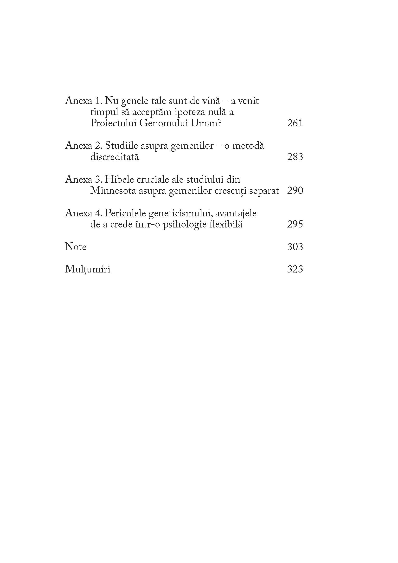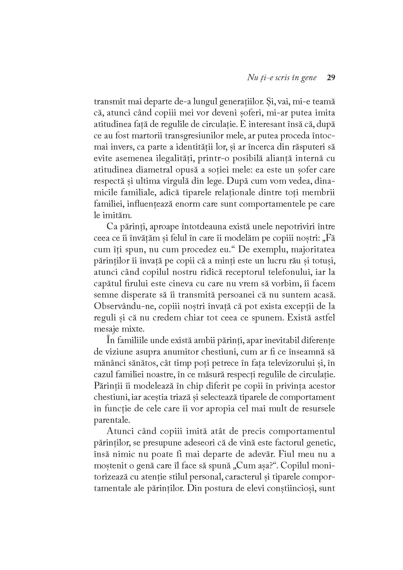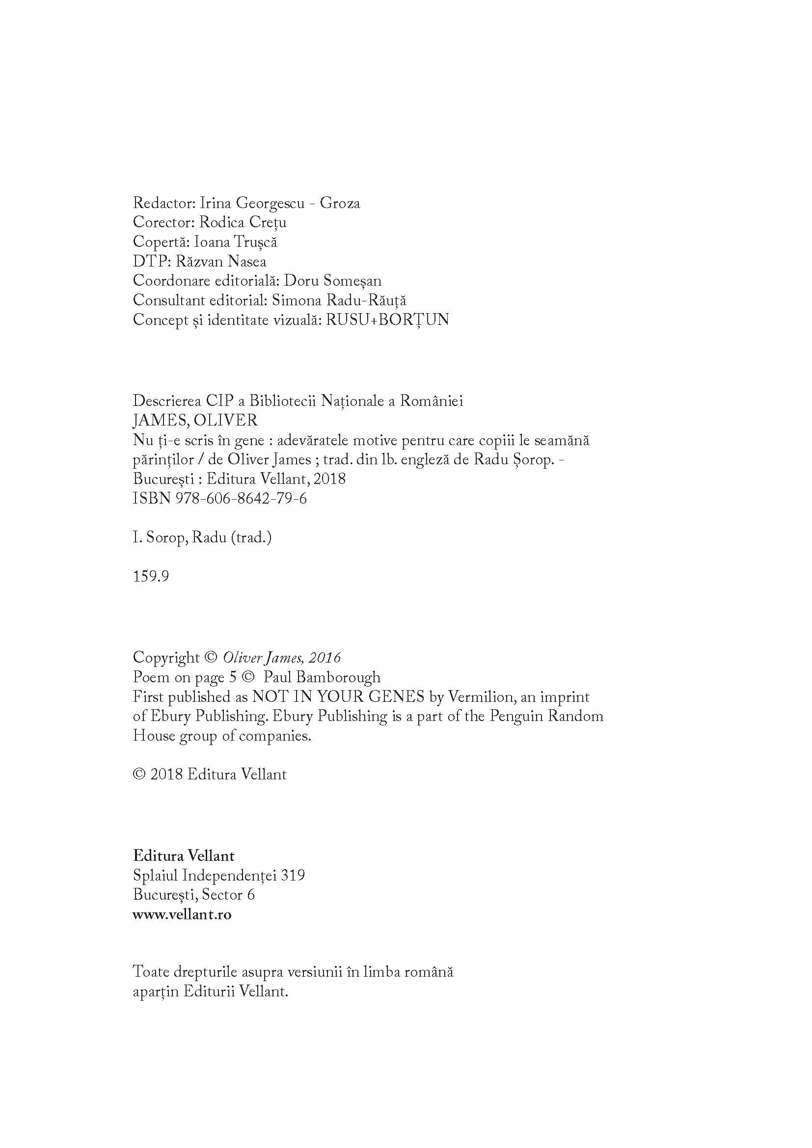 Ce-ai spune dacă ai afla că tendinţele uşor obsesive ale celui mai bun prieten sau comportamentul ocazional morocănos al copilului tău ar fi rezultatul moştenirii primite de la părinţi, doar că nu pe cale genetică? În ultima sa carte-pledoarie pentru rolul creşterii şi educaţiei asupra personalităţii viitorului adult, Oliver James pune la îndoială unele dintre cele mai adânc înrădăcinate prezumţii despre felul în care moştenirea genetică ne pune la cale destinul. Nu ți-e scris în gene este un strigăt împotriva tiraniei „destinului genetic” şi un apel pentru „bună-creștere.”
