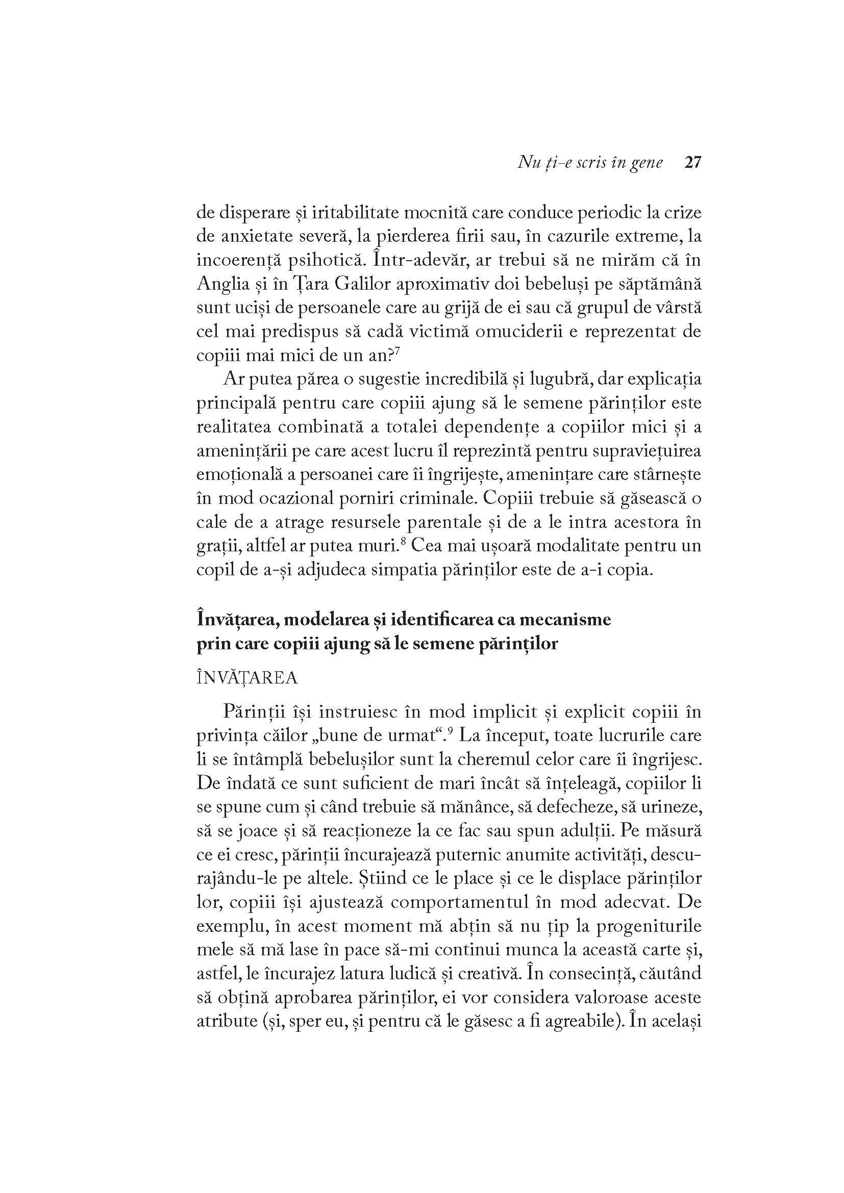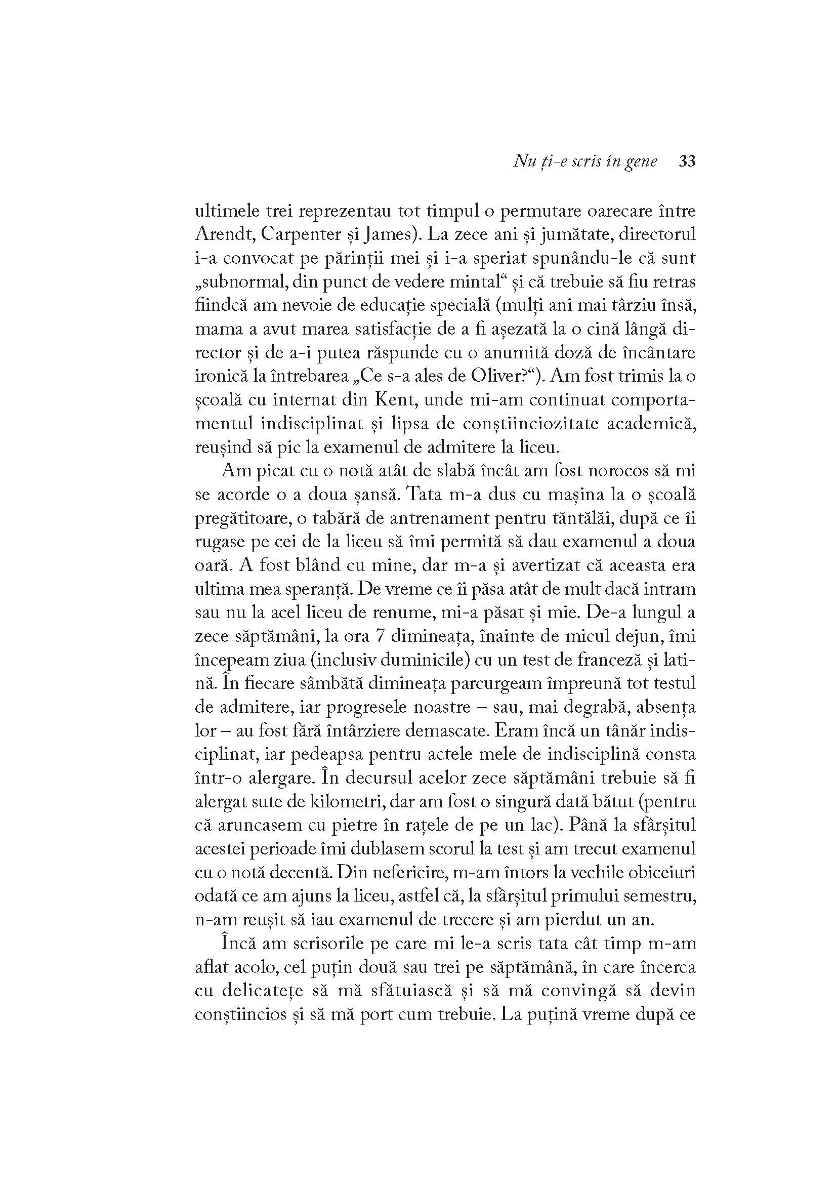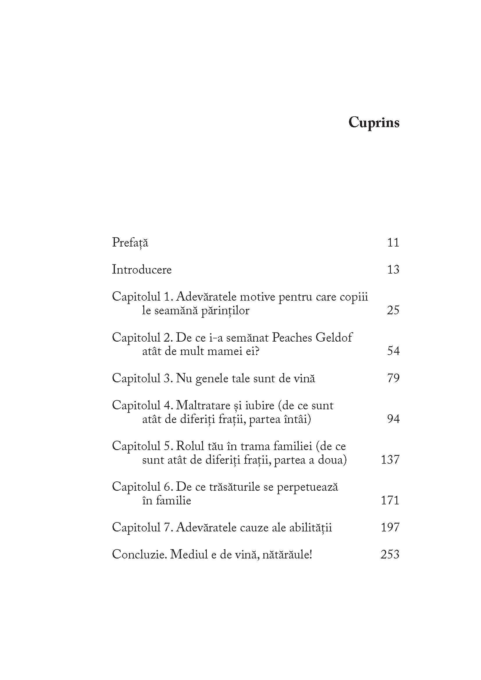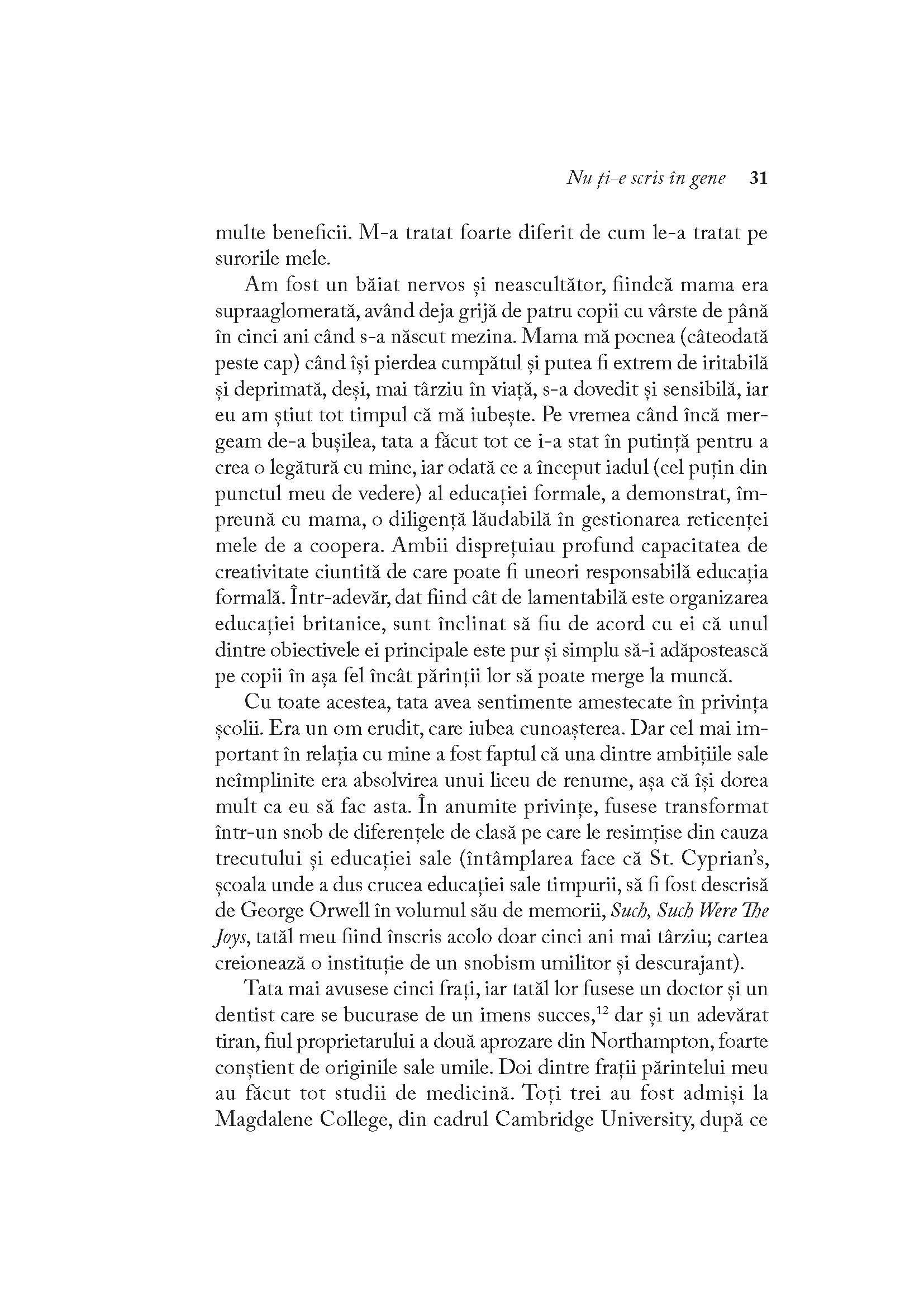 Ce-ai spune dacă ai afla că tendinţele uşor obsesive ale celui mai bun prieten sau comportamentul ocazional morocănos al copilului tău ar fi rezultatul moştenirii primite de la părinţi, doar că nu pe cale genetică? În ultima sa carte-pledoarie pentru rolul creşterii şi educaţiei asupra personalităţii viitorului adult, Oliver James pune la îndoială unele dintre cele mai adânc înrădăcinate prezumţii despre felul în care moştenirea genetică ne pune la cale destinul. Nu ți-e scris în gene este un strigăt împotriva tiraniei „destinului genetic” şi un apel pentru „bună-creștere.”