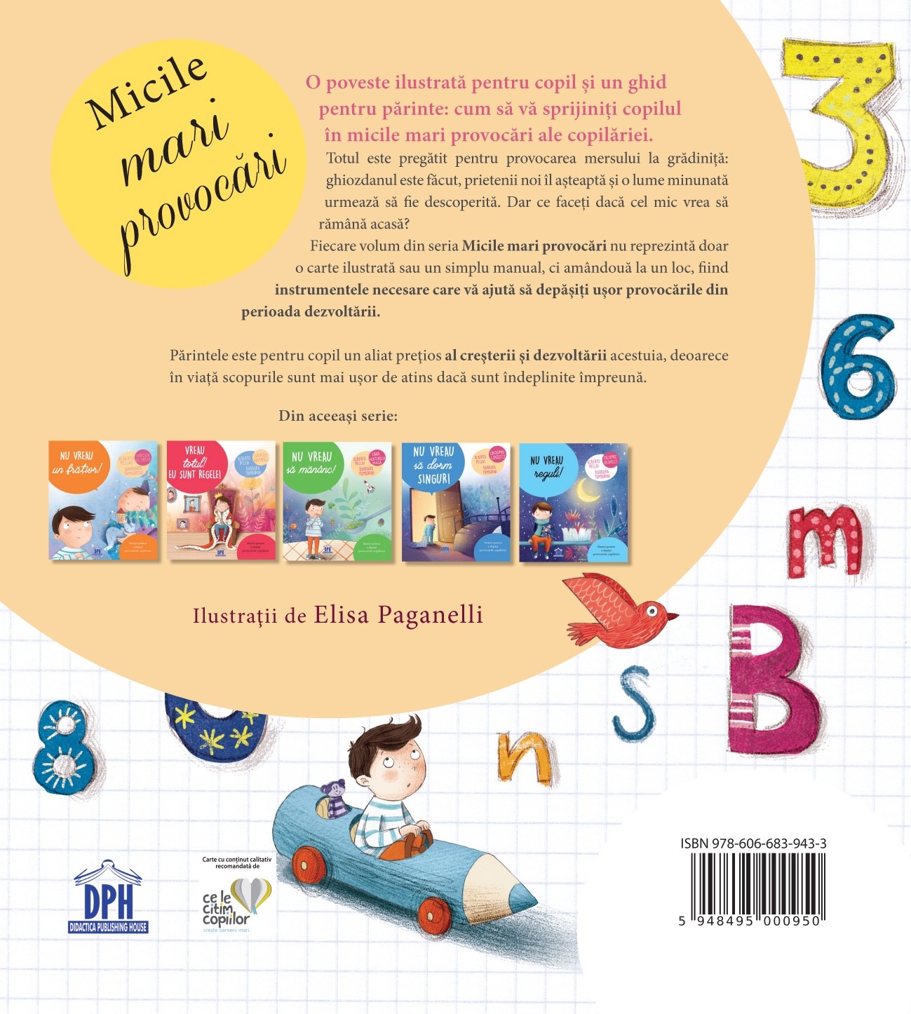 Totul este pregătit pentru provocarea mersului la grădiniță: ghiozdanul este făcut, prietenii noi îl așteaptă și o lume minunată urmează să fie descoperită. Dar ce faceți dacă cel mic vrea să rămână acasă? Fiecare volum din seria Micile mari provocări nu reprezintă doar o carte ilustrată sau un simplu manual, ci amândouă la un loc, fiind instrumentele necesare care vă ajută să depășiți ușor provocările din perioada dezvoltării.