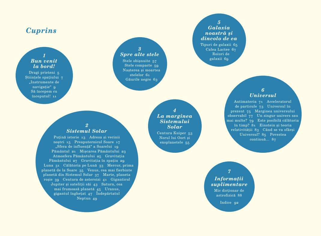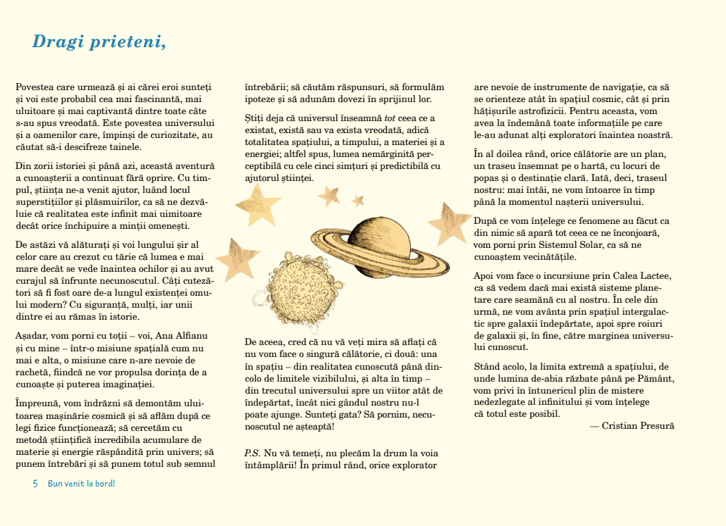 „Dragi prieteni, astăzi pornim într-o palpitantă călătorie prin univers. Misiunea noastră spațială n-are nevoie de rachetă, fiindcă ne vor propulsa dorinţa de a cunoaşte şi puterea imaginaţiei. Împreună, vom îndrăzni să demontăm uluitoarea maşinărie cosmică şi să aflăm după ce legi funcţionează, să cercetăm cu metodă ştiinţifică incredibila acumulare de materie şi energie răspândită prin univers, să punem întrebări și să căutăm răspunsuri. Sunteţi gata? Să pornim, necunoscutul ne aşteaptă!" – CRISTIAN PRESURĂ