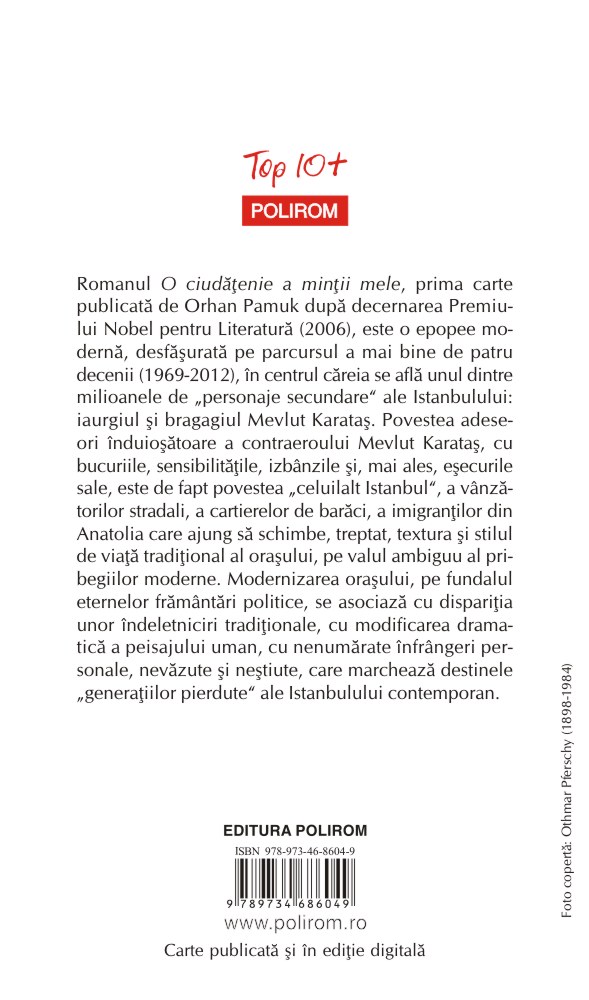 Romanul O ciudăţenie a minţii mele, prima carte publicată de Orhan Pamuk după decernarea Premiului Nobel pentru Literatură (2006), este o epopee modernă, desfăşurată pe parcursul a mai bine de patru decenii (1969-2012), în centrul căreia se află unul dintre milioanele de „personaje secundare” ale Istanbulului: iaurgiul şi bragagiul Mevlut Karataş. Povestea adeseori înduioşătoare a contraeroului Mevlut Karataş, cu bucuriile, sensibilităţile, izbînzile şi, mai ales, eşecurile sale, este de fapt povestea „celuilalt Istanbul”, a vînzătorilor stradali, a cartierelor de barăci, a imigranţilor din Anatolia care ajung să schimbe, treptat, textura şi stilul de viaţă tradiţional al oraşului, pe valul ambiguu al pribegiilor moderne. Modernizarea oraşului, pe fundalul eternelor frămîntări politice, se asociază cu dispariţia unor îndeletniciri tradiţionale, cu modificarea dramatică a peisajului uman, cu nenumărate înfrîngeri personale, nevăzute şi neştiute, care marchează destinele „generaţiilor pierdute” ale Istanbulului contemporan.