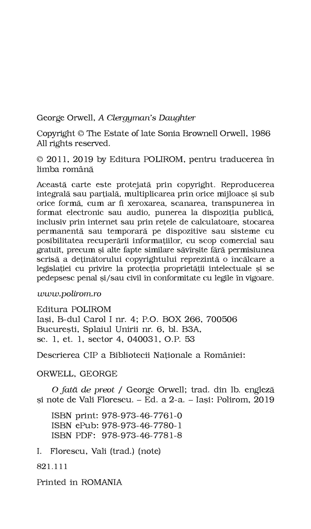 Dorothy Hare, protagonista romanului O fată de preot, fiica unui paroh dintr-un orăşel de ţară, duce o viaţă anevoioasă, marcată de lipsuri, dar aşezată. Felul în care trăieşte pare să i se potrivească şi îşi îndeplineşte sarcinile condusă de credinţă şi de puterea morală, care o ajută să treacă peste ceasurile de oboseală şi disperare. Împrejurări neaşteptate o aruncă însă în lumea metropolei londoneze sau a periferiilor mizere ale unui oraş în care Dorothy are ocazia să cunoască puterea banului. Aventura protagonistei devine prilej pentru schiţa unei societăţi în care diferenţele de clasă sînt fatale, prejudecăţile abundă, apartenenţa la o biserică sau alta devine un joc de aparenţe, din nou, fatal în ochii cuvioşilor din mahala, iar credinţa începe să-i slăbească în faţa îndoielilor.