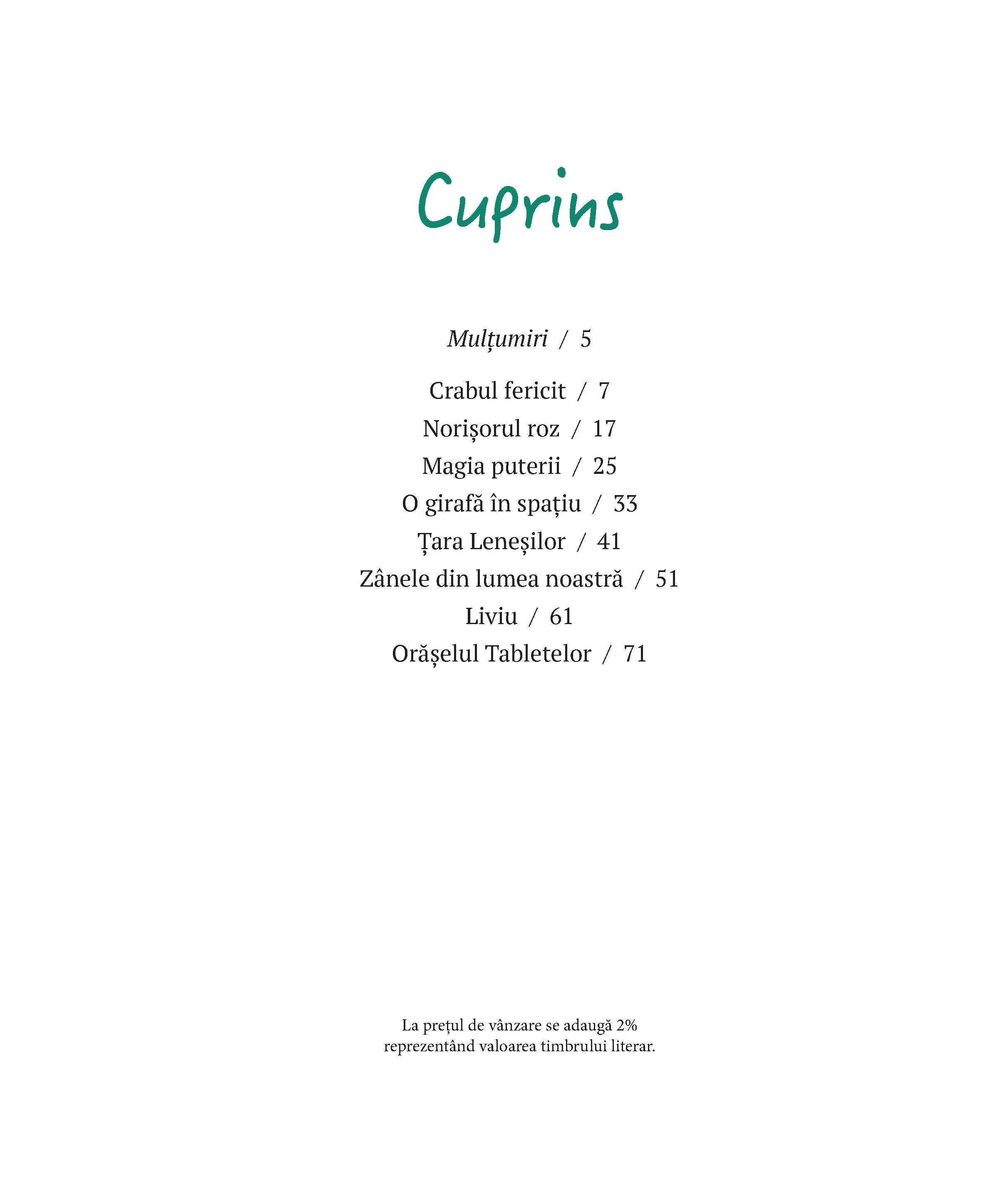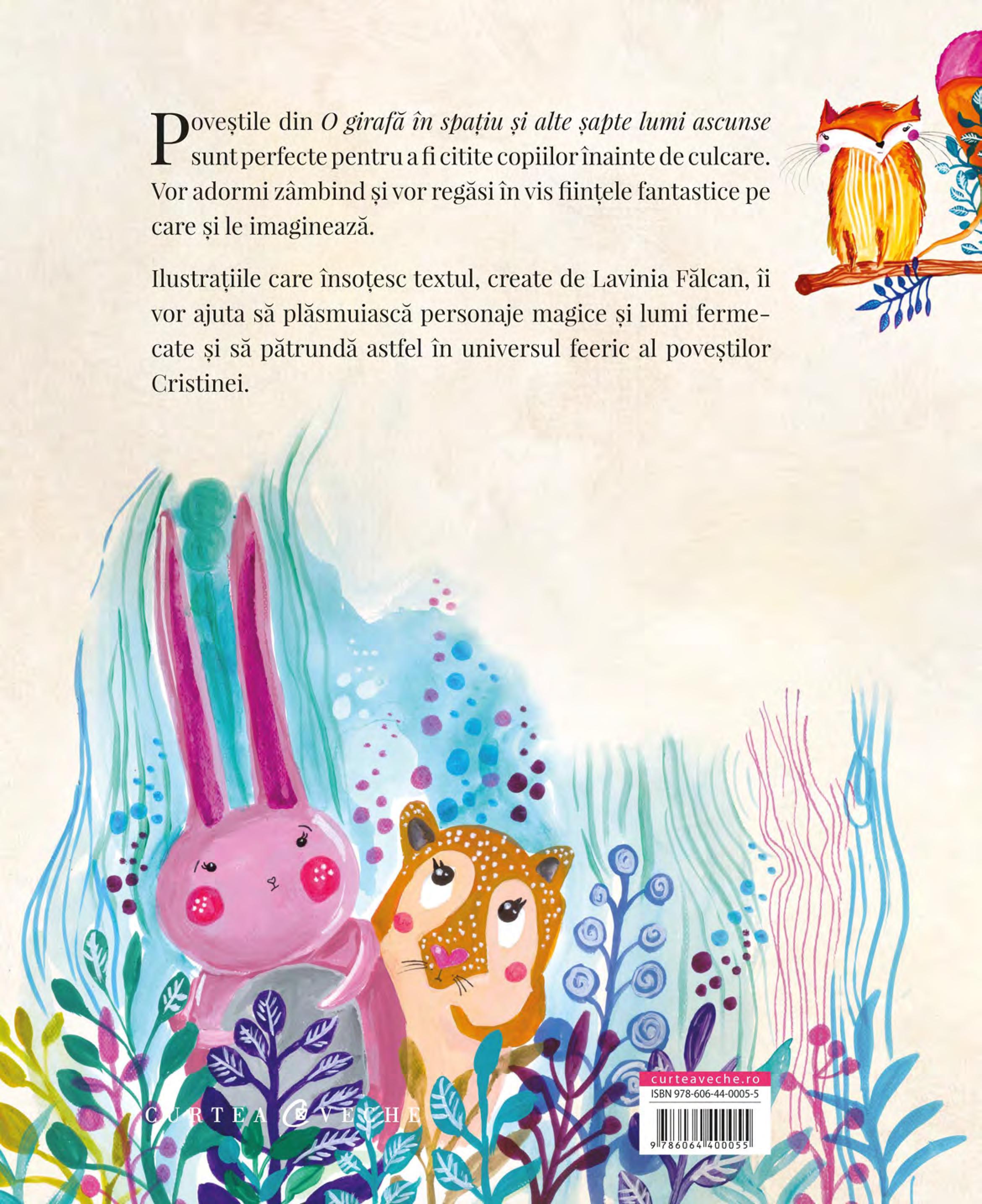 Poveştile din ''O girafă în spaţiu şi alte şapte lumi ascunse'' sunt perfecte pentru a fi citite copiilor seara, înainte de culcare. Aceştia vor adormi zâmbind şi vor regăsi în vis fiinţele fantastice pe care şi le imaginează.