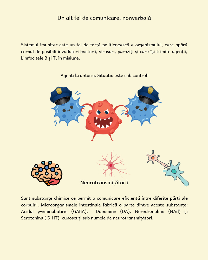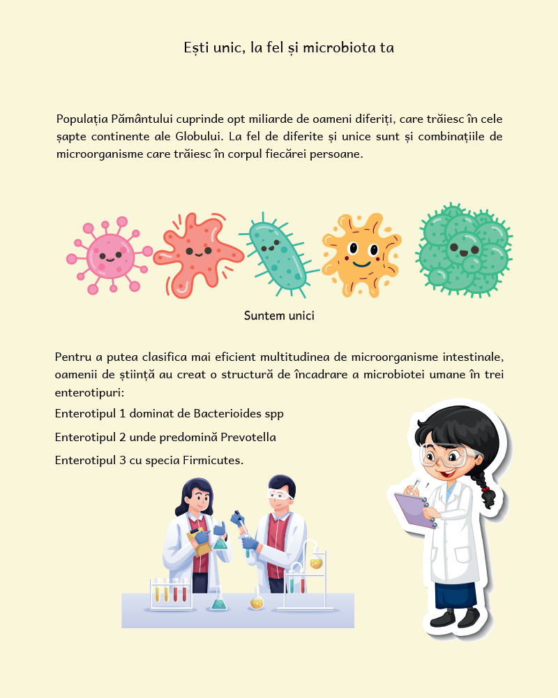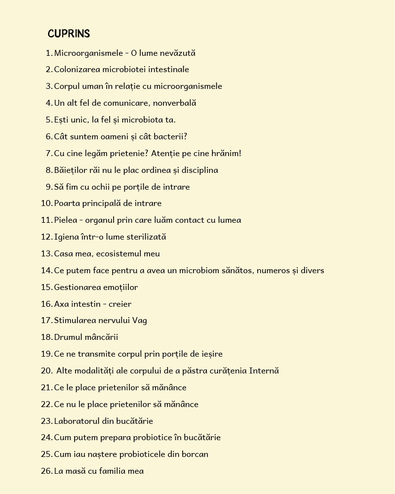 Dedic această carte tuturor copiilor și părinților curioși de a păși în propriul univers interior, pe care zilnic îl construiesc conștient sau inconștient, prin alegerile alimentare, prin mișcare, prin ceea ce gândesc, vorbesc, împărtășesc, trăiesc și iubesc. Dar, în special, o dedic mamelor, prin care ia naștere viața și microbiota fiecărui Om născut.