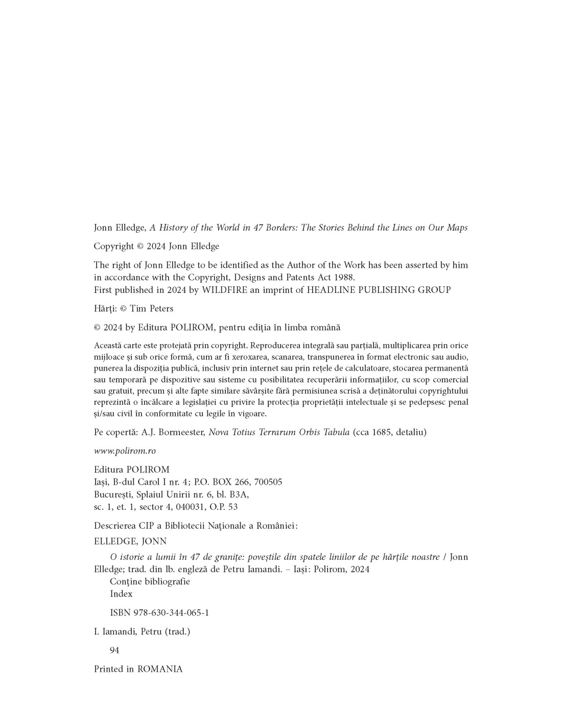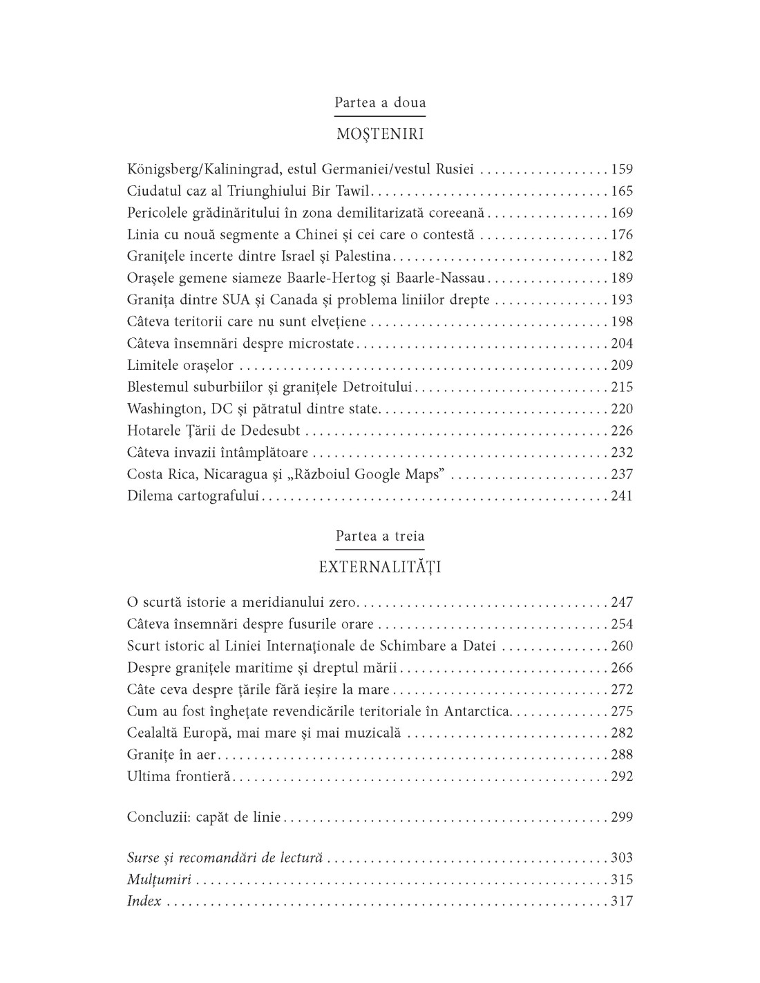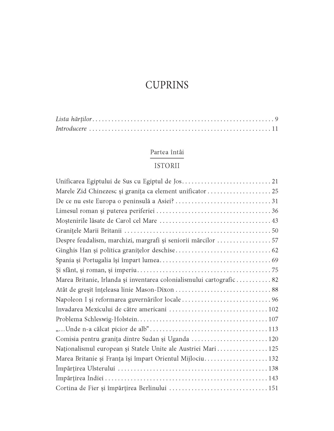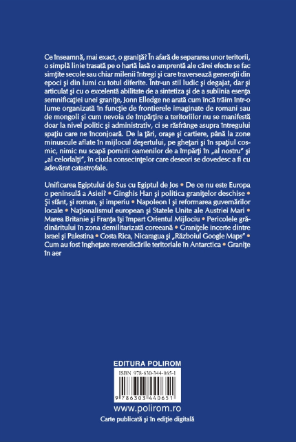 În afară de separarea unor teritorii, o simplă linie trasată pe o hartă lasă o amprentă ale cărei efecte se fac simţite secole sau chiar milenii întregi şi care traversează generaţii din epoci şi din lumi cu totul diferite. Într-un stil ludic şi degajat, dar şi articulat şi cu o excelentă abilitate de a sintetiza şi de a sublinia esenţa semnificaţiei unei graniţe, Jonn Elledge ne arată cum încă trăim într-o lume organizată în funcţie de frontierele imaginate de romani sau de mongoli şi cum nevoia de împărţire a teritoriilor nu se manifestă doar la nivel politic şi administrativ, ci se răsfrânge asupra întregului spaţiu care ne înconjoară.