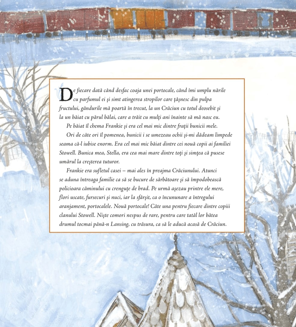 Multe generații s-au perindat de atunci. Dragul nostru Frankie n-a apucat să treacă de vârsta copilăriei. Pentru el, Crăciunul acela a fost și ultimul. Însă nepoții și strănepoții Stellei – ca și urmașii fraților și ai surorilor ei – încă își împodobesc șemineul cu portocale și crenguțe de brad. Așa facem cu toții în fiecare an în preajma Crăciunului.
