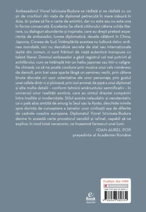 Ambasadorul Viorel Isticioaia-Budura se răsfață și ne răsfață cu un șir de crochiuri din viața de diplomat petrecută în mare măsură în Asia. Ar putea să fie o carte de amintiri, dar nu este sau nu este una în forma consacrată. Excelența Sa oferă cititorului câteva schițe literare, cu dialoguri abundente și inspirate, care au drept pretext experiența de ambasador, lumea diplomatică, desele călătorii în China, Japonia, Coreea de Sud. Întâmplările acestea nu tulbură deloc ordinea mondială, nici nu dezvăluie secrete de stat sau internaționale ieșite din comun, ci sunt frânturi de viață autentică transpuse cu talent literar. Domnul ambasador a găsit registrul cel mai potrivit al echilibrului, cum se întâmplă într-un haiku japonez sau într-o caligrafie chineză, ca să ne poată conduce prin muzica unui vals românesc de demult, prin trei vaze sparte lângă un șemineu vechi, prin câteva ținute discrete ori ușor ostentative ale unor personaje, prin gustul unei cafele dintr-o zi ploioasă, prin izul aromat de pipă a unui diplomat și alte multe detalii – conform tehnicii amănuntului semnificativ – în universul unor realități exotice, care au simțul dreptei cumpăniri între tradiție și modernitate. Stilul acesta nelaudativ și neostentativ, ca o pală abia simțită de amurg la Seul sau la Kyoto, deschide inimile spre dorința de cunoaștere a tainelor unor civilizații așa de diferite de cadrele noastre europene. Diplomatul Viorel Isticioaia-Budura devine în această carte prozatorul sensibil și rafinat, capabil să ne explice, în mod total necanonic, ce înseamnă farmecul unei lumi. IOAN-AUREL POP preşedinte al Academiei Române