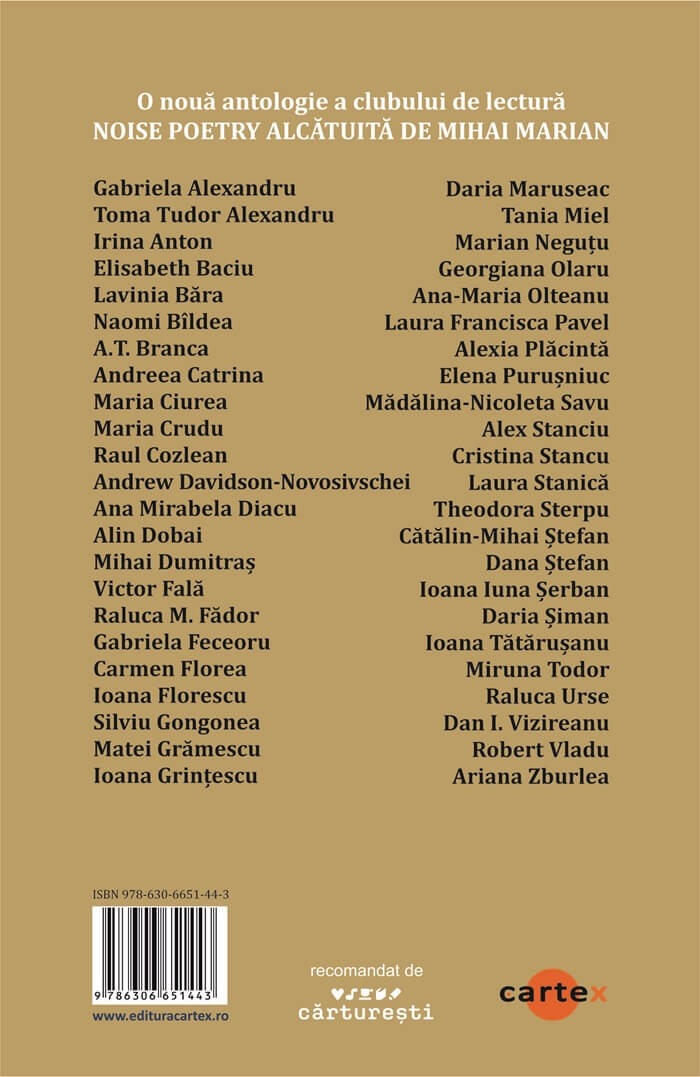 Ceea ce se desfasoara in paginile acestei noi antologii nu este o simpla prelungire a unui demers poetic anterior, ci o expansiune dialectica a unei forme de gandire poetica angajata, transgresiva, si auto-reflexiva. Daca prima antologie, Ce-ti spui noaptea inainte de culcare (Editura Cartex, 2024), a adus laolalta o polifonie de voci traversate de o sensibilitate acuta si o poetica a insomniei lucide, aceasta a doua iteratie – deopotriva complementara si autonoma – revendica spatiul poeziei ca teren de lupta ontologic, ca laborator de deconstructie si reconstruire valorica. -- Mihai Marian