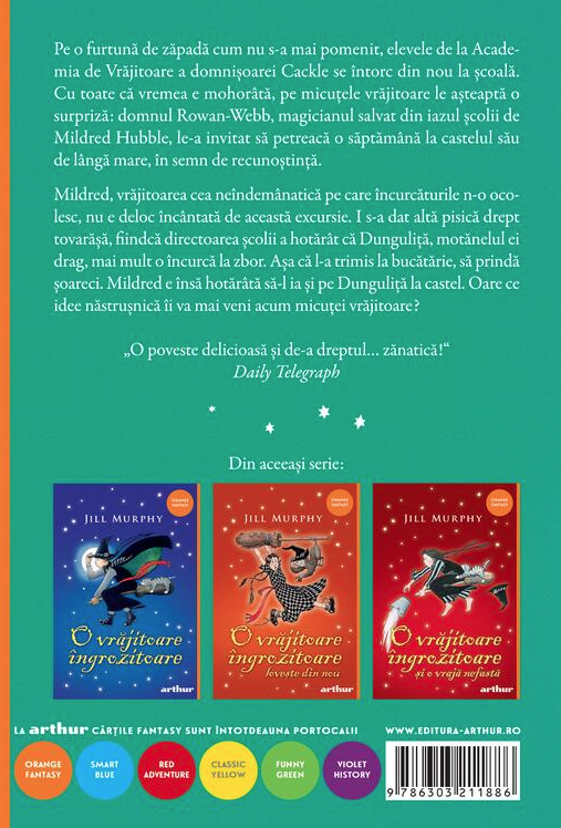 Mildred, vrăjitoarea cea neîndemânatică pe care încurcăturile n-o ocolesc, nu e deloc încântată de această excursie. I s-a dat altă pisică drept tovarăşă, fiindcă directoarea școlii a hotărât că Dunguliță, motănelul ei drag, mai mult o încurcă la zbor. Aşa că l-a trimis la bucătărie, să prindă şoareci. Mildred e însă hotărâtă să-l ia și pe Dunguliță la castel. Oare ce idee năstruşnică îi va mai veni acum micuței vrăjitoare?