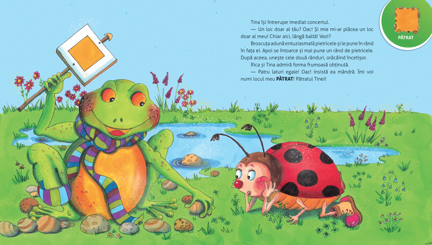 Broscuța Tina și prietenii ei creează și explorează diverse forme geometrice, cum ar fi pătratul, triunghiul, rombul și cercul, fiecare având un loc special doar al lor. Fiecare animal își definește propriul loc în funcție de forma geometrică preferată, iar aceste concepte sunt prezentate într-un limbaj accesibil și distractiv pentru copii.
