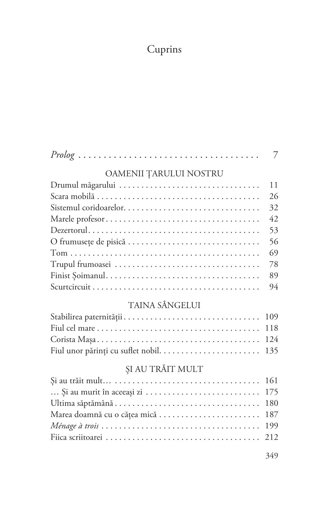 Oamenii țarului nostru reunește tablouri și personaje cât se poate de diverse – fiice de scriitoare împovărate de descendența lor, frumoase apăsate de propria frumusețe, un reglor la o fabrică de ceasuri atras de scrierile lui Rudolf Steiner, o moldoveancă îndrăgostită de viață, un olandez antipatic, o pisică recalcitrantă, apartamente la comun în care locatarii sunt nevoiți să-și ducă zilele într-o resemnare mocnind a furie, un tren cu lume pestriță, avioane militare străbătând neliniștitor cerul în august 1968... Crâmpeie de viață ce par a se combina infinit în imagini perfect coerente, ca bucățelele de sticlă colorată dintr-un caleidoscop, pentru a reda povestea omului obișnuit, cu visuri mărunte sau mari aspirații, cu duioșii, răutăți, iubiri, invidii, bucurii, suferință, dezamăgiri și moarte.