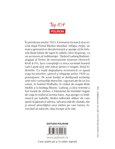 Inflaţia creşte, iar marca germană se devalorizează şi ajunge să fie folosită drept hârtie de tapet în odăile celor disperaţi, ca un accesoriu al indiferenţei. Tânărul Ludwig Bodmer, angajat al firmei de monumente funerare Heinrich Kroll & Fiii, face cunoştinţă cu mica societate boemă care-l ajută să-şi uite măcar pentru o noapte, două îndoielile.