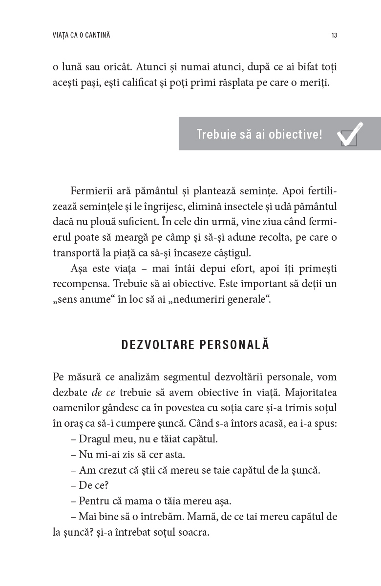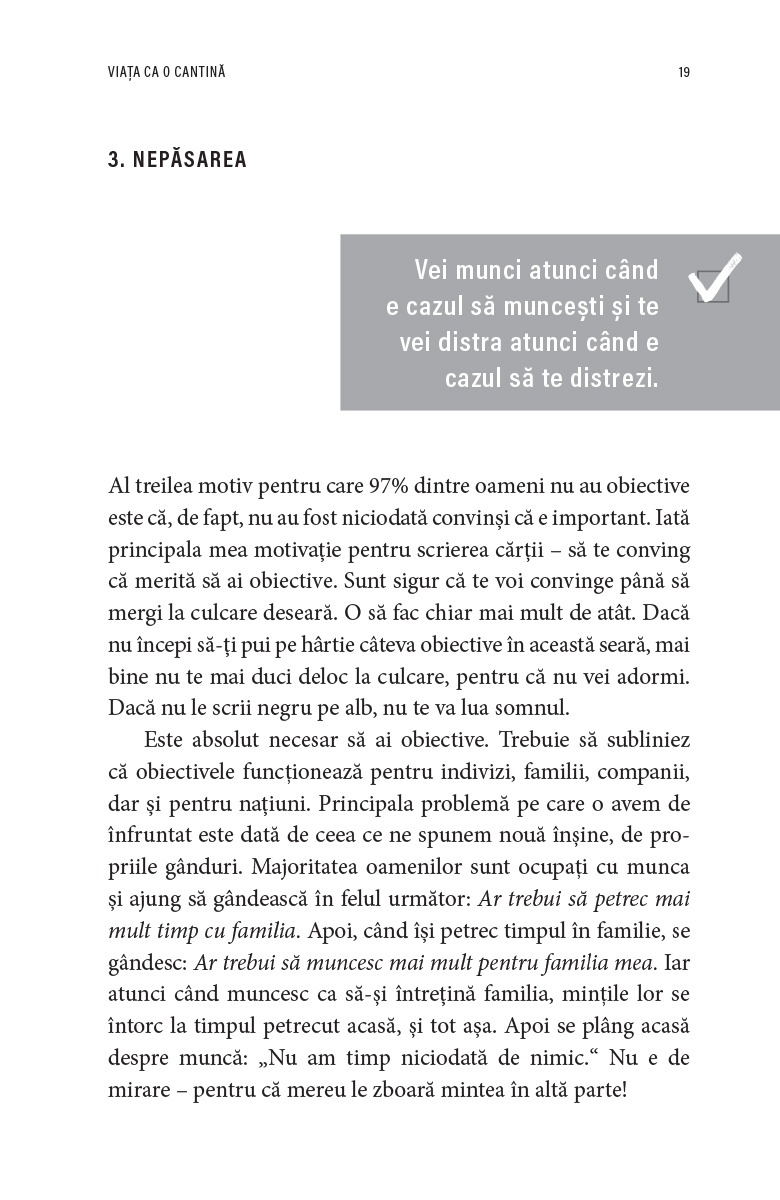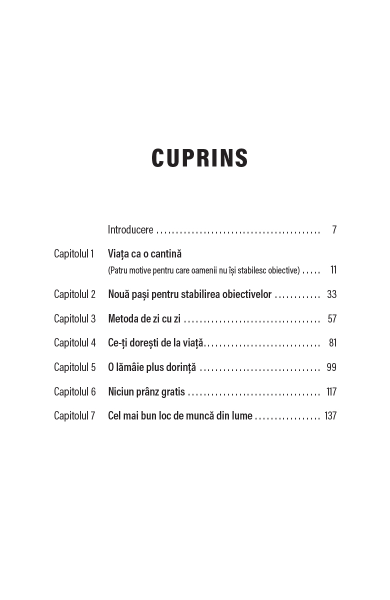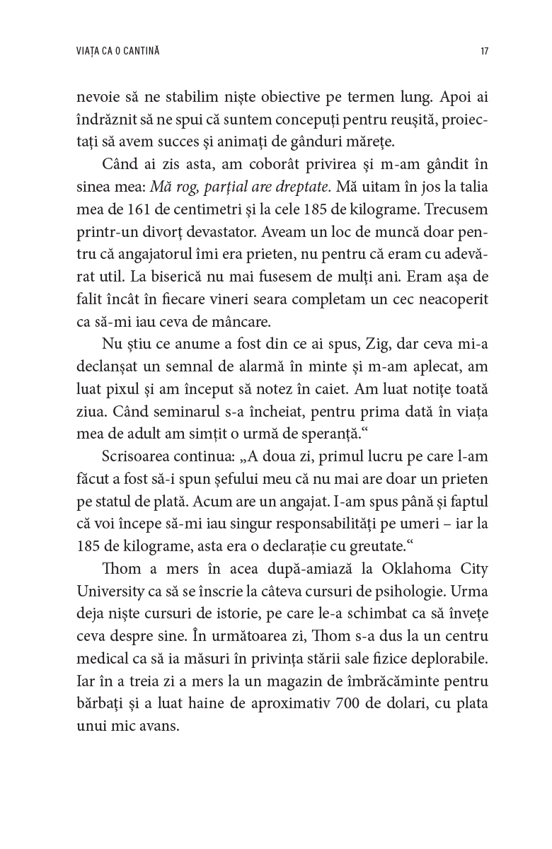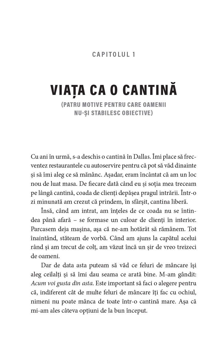 Alături de Zig Ziglar, vei afla motivele pentru care oamenii duc uneori o viață lipsită de țeluri și de sens, vei primi sfaturi care să te călăuzească în călătoria ta și vei descoperi activitățile revoluționare pe care le poți îndeplini chiar azi ca să fii mai aproape de obiectivele tale.