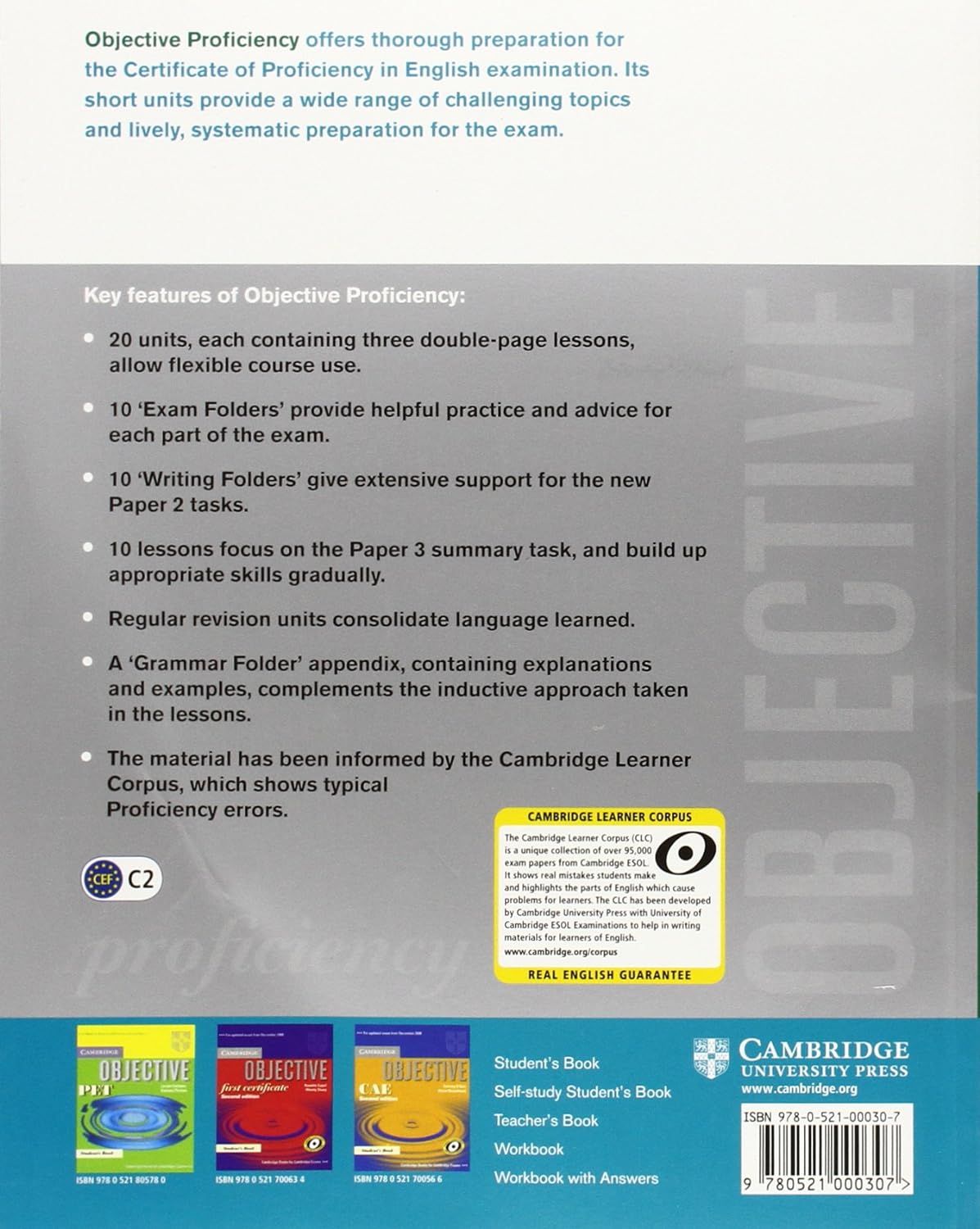 This new course offers thorough preparation for the revised Certificate of Proficiency in English examination (December 2002 syllabus). Written by the authors of Objective First Certificate, it has the same easy-to-use approach and organisation. Twenty short units provide a wide range of topics, offering lively systematic preparation for the exam. Key features include three, two-page lessons per unit; 'Exam folders' with practice and advice for each part of the exam; 'Writing folders' with extensive support for the new paper 2 tasks; ten separate lessons on the paper 3 summary task; regular revision units; a 'Grammar folder' appendix, containing explanations and examples, and a 'Self-study folder' with answers to all exercises, thorough explanations, and tapescripts. The material has been informed by the Cambridge Learner Corpus which shows typical Proficiency errors.