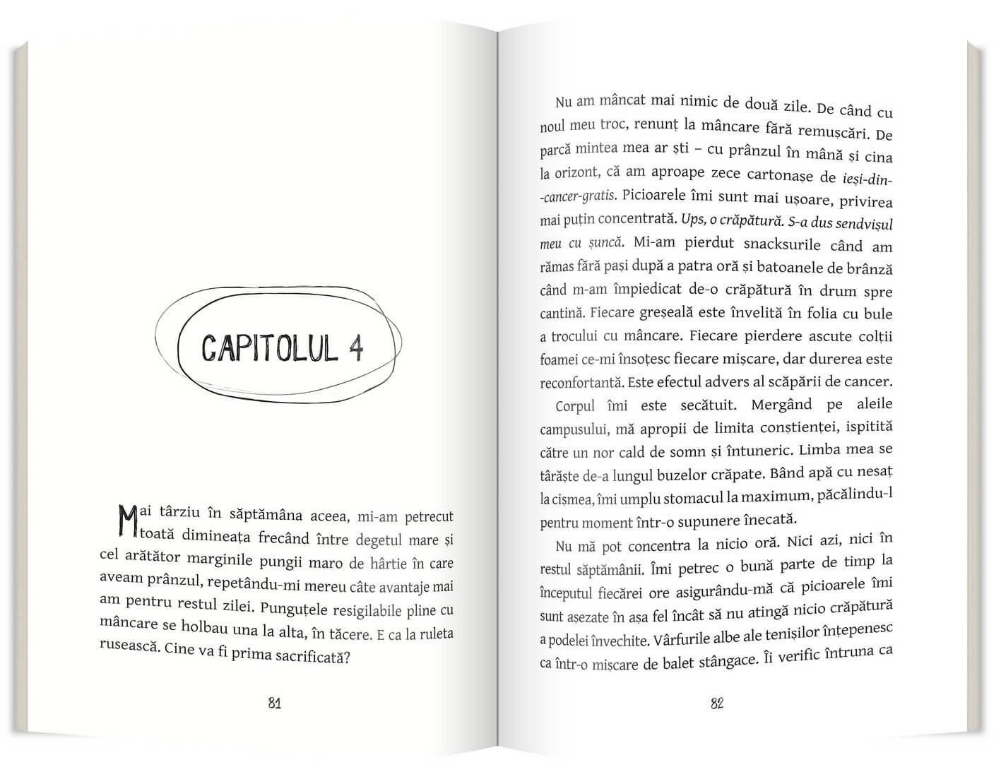 cauzează cancer cerebral. Îmi acopăr urechile cu palmele și mă prăbușesc pe trotuarul călduț. Prin durerea radiantă, simt cum răzbate același gând, la nesfârșit: Crăpăturile cauzează cancer cerebral. Crăpăturile cauzează cancer cerebral. Crăpăturile cauzează cancer cerebral."