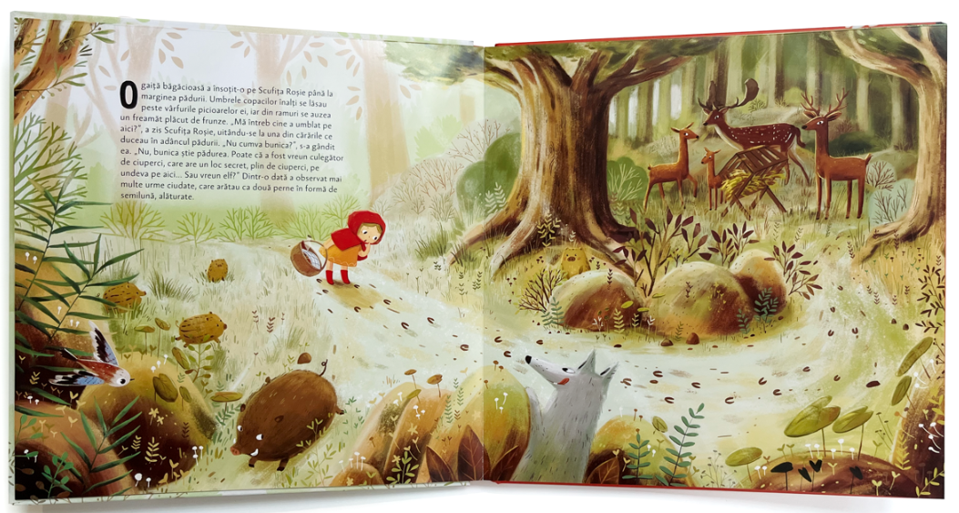 A fost odată ca niciodată o fetiță foarte curioasă, cu o pălărie roșie, pe care toată lumea o numea doar Scufița Roșie. Poate ai auzit că ea mergea la bunica ei și întâlnește lupul pe drum. Dar puțini oameni știu că în călătoria sa plină de aventuri, ea s-a întâlnit și cu alte animale din pădure, precum păsări cântătoare, o veveriță, cerbi, furnici și mulți alții.