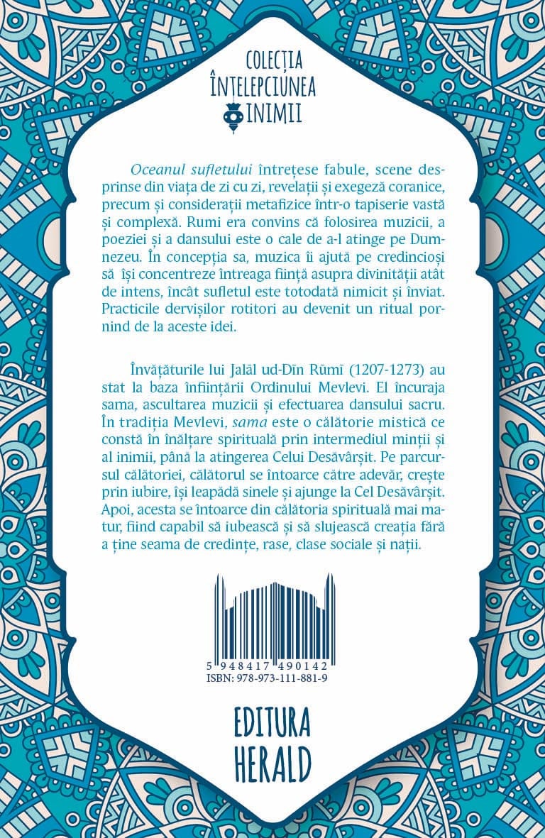 Oceanul sufletului intretese fabule, scene desprinse din viata de zi cu zi, revelatii si exegeza coranice, precum si consideratii metafizice intr-o tapiserie vasta si complexa. Rumi era convins ca folosirea muzicii, a poeziei si a dansului este o cale de a-l atinge pe Dumnezeu. In conceptia sa, muzica ii ajuta pe credinciosi sa isi concentreze intreaga fiinta asupra divinitatii atat de intens, incat sufletul este totodata nimicit si inviat. Practicile dervisilor rotitori au devenit un ritual pornind de la aceste idei.