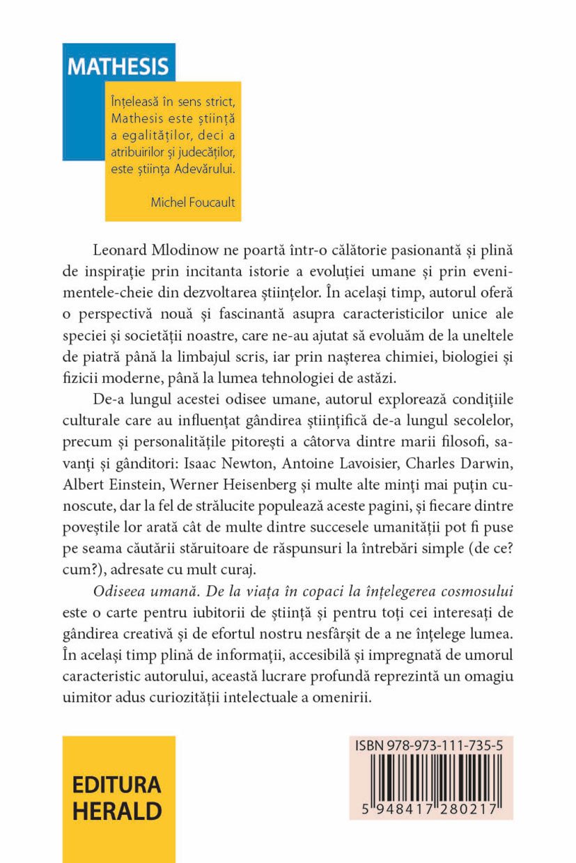 Leonard Mlodinow ne poarta intr-o calatorie pasionanta si plina de inspiratie prin incitanta istorie a evolutiei umane si prin evenimentele-cheie din dezvoltarea stiintelor. In acelasi timp, autorul ofera o perspectiva noua si fascinanta asupra caracteristicilor unice ale speciei si societatii noastre, care ne-au ajutat sa evoluam de la uneltele de piatra pâna la limbajul scris, iar prin nasterea chimiei, biologiei si fizicii moderne, pâna la lumea tehnologiei de astazi.
