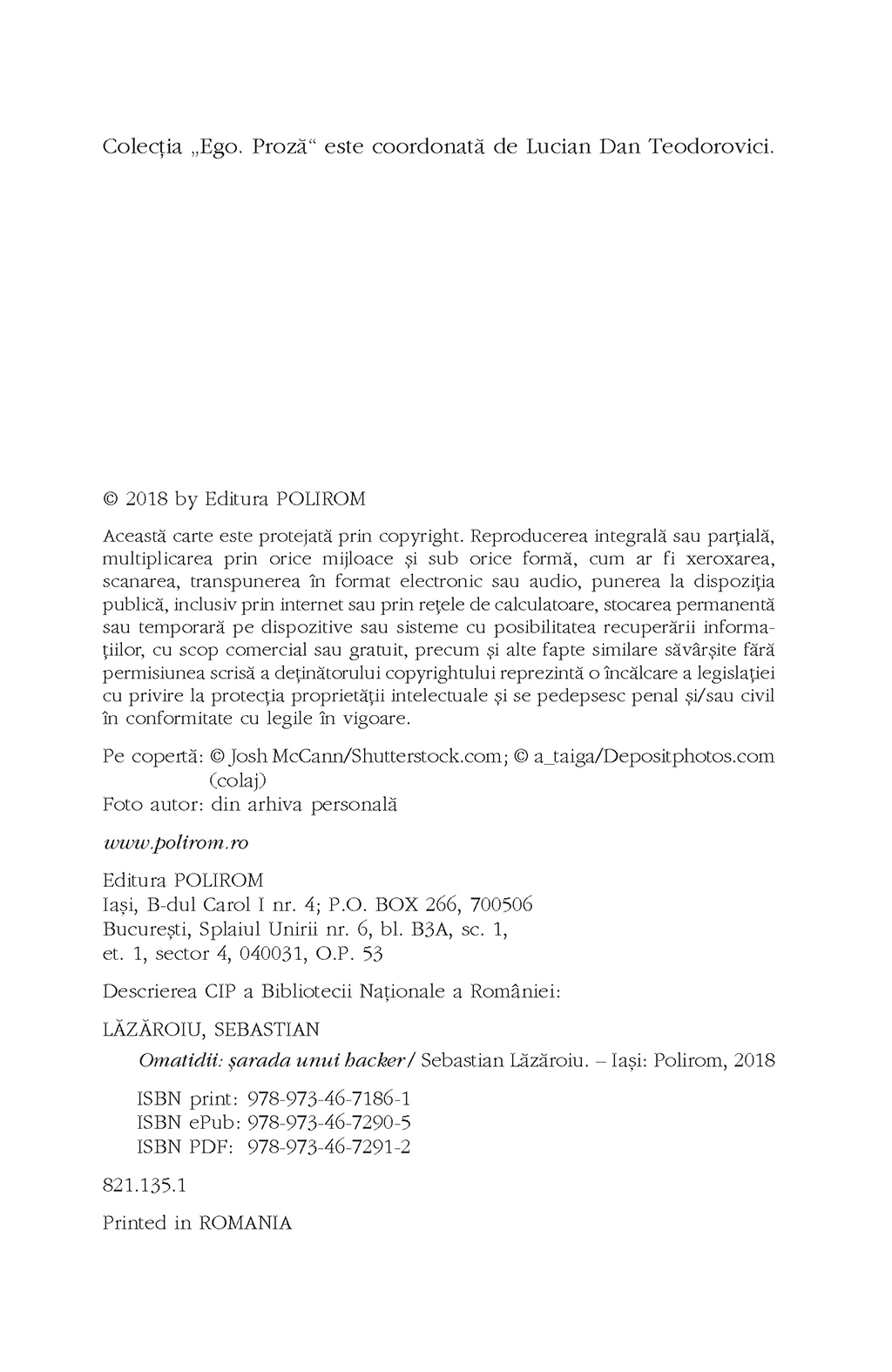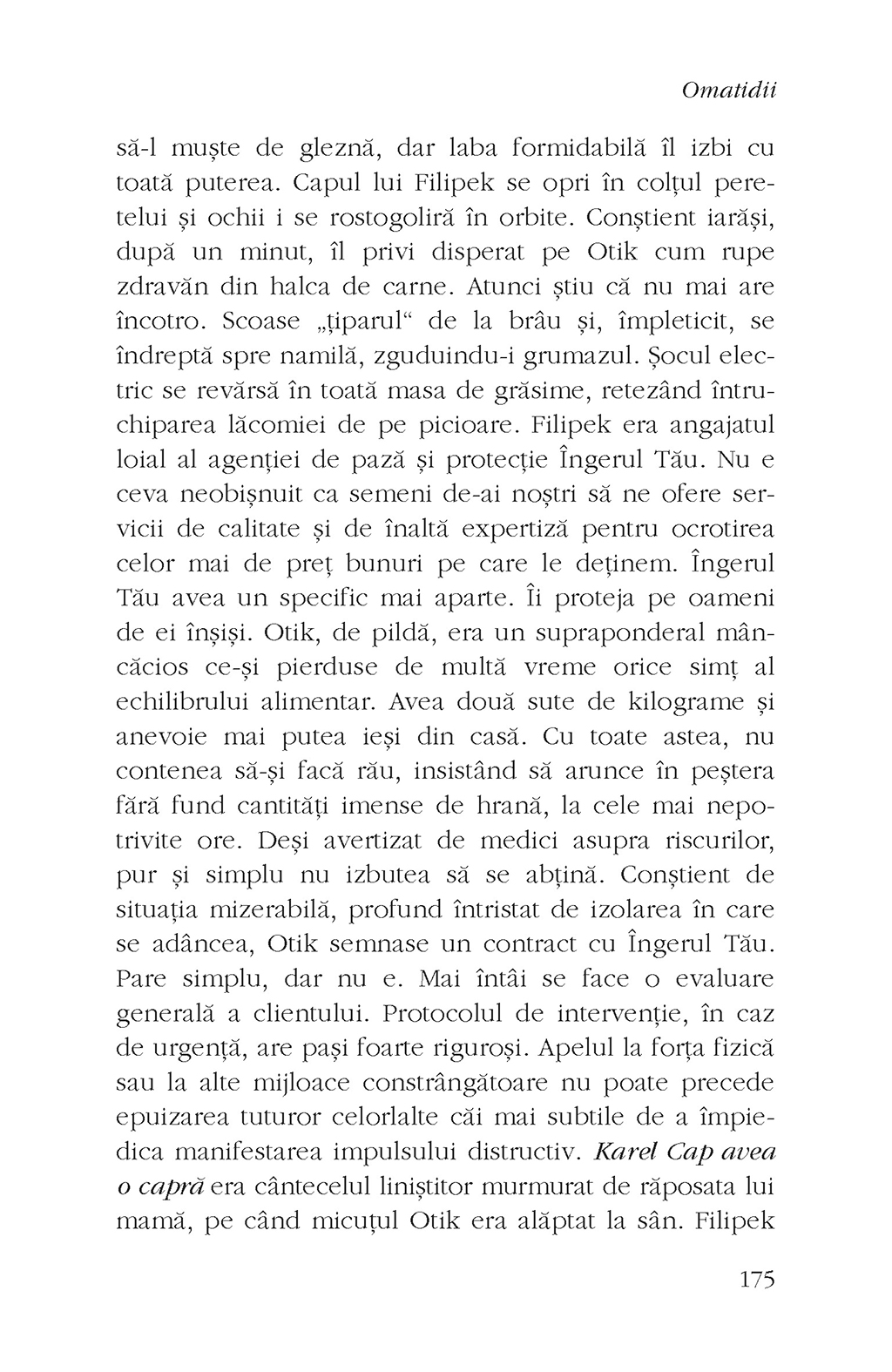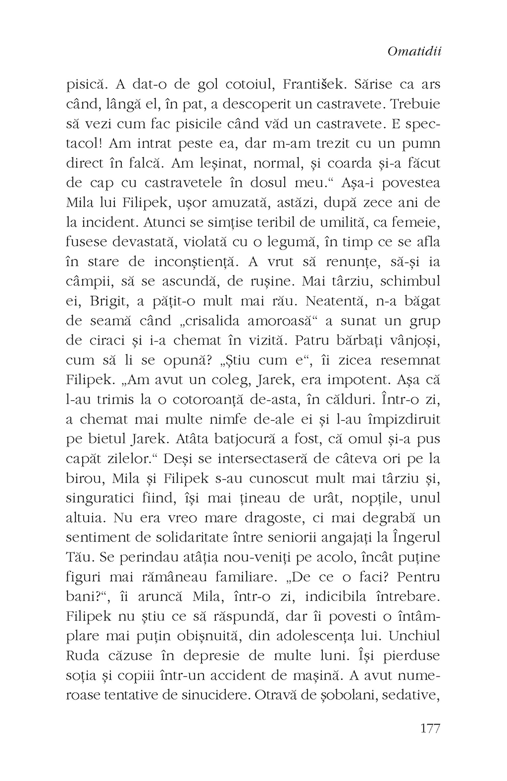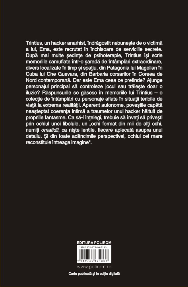Trintius, un hacker anarhist, îndrăgostit nebuneşte de o victimă a lui, Ema, este recrutat în închisoare de serviciile secrete. După mai multe şedinţe de psihoterapie, Trintius îşi scrie memoriile camuflate într-o şaradă de întîmplări extraordinare, divers localizate în timp şi spaţiu, din Patagonia lui Magellan în Cuba lui Che Guevara, din Barbaria corsarilor în Coreea de Nord contemporană. Dar este Ema ceea ce pretinde? Ajunge personajul principal să controleze jocul sau trăieşte doar o iluzie? Răspunsurile se găsesc în memoriile lui Trintius – o colecţie de întîmplări cu personaje aflate în situaţii teribile de viaţă la extrema realităţii. Aparent autonome, poveştile capătă neaşteptat coerenţa intimă a traumelor unui hacker hăituit de propriile fantasme. Ca să-l înţelegi, trebuie să înveţi să priveşti prin ochiul unei libelule, un „ochi format din mii de alţi ochi, numiţi omatidii, ca nişte lentile, fiecare aplecată asupra unui detaliu. Şi din toate adîncimile perspectivei, ochiul cel mare reconstituie întreaga imagine”.
