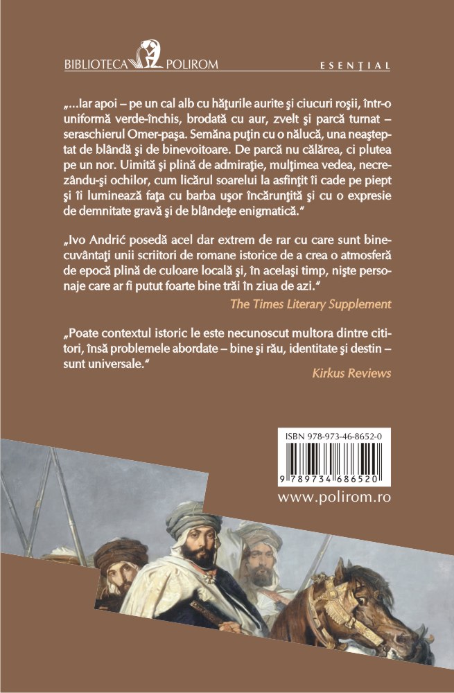 „Ivo Andrić posedă acel dar extrem de rar cu care sunt bine-cuvântaţi unii scriitori de romane istorice de a crea o atmosferă de epocă plină de culoare locală şi, în acelaşi timp, nişte personaje care ar fi putut foarte bine trăi în ziua de azi.” (The Times Literary Supplement)