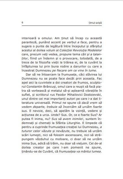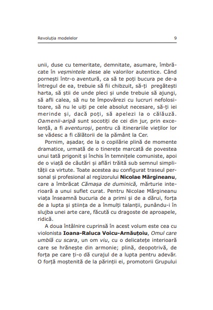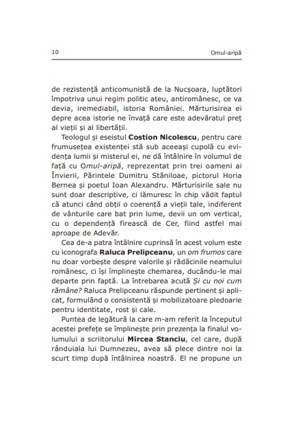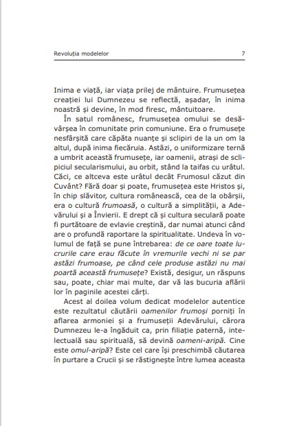 Acest al doilea volum dedicat modelelor autentice este rezultatul căutării oamenilor frumoși porniți în aflarea armoniei și a frumuseții Adevărului, cărora Dumnezeu le-a îngăduit ca, prin filiație paternă, intelectuală sau spirituală, să devină oameni-aripă. Cine este omul-aripă? Este cel care își preschimbă căutarea în purtare a Crucii și se răstignește între lumea aceasta și veșnicie, într-o bună măsură, prin asumarea harului și înmulțirea talantului său. Aripa presupune acțiune, deci faptă. Înțelesul deplin al acestei afirmații îl veți afla în paginile care urmează.