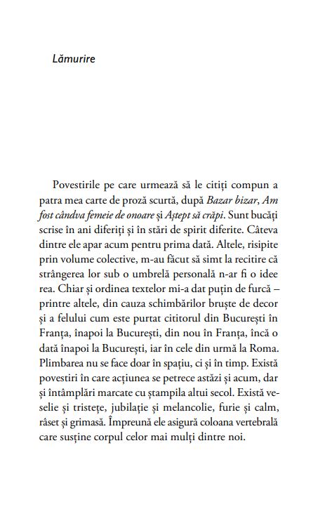 Un bărbat se trezeşte ducându-şi viaţa sub dominaţia unei cifre. Un altul e luat de pe o bancă din parc şi pus să imite, într-un show ţinut în inima Capitalei, un şarlatan presat de urgenţe neamânabile. Un preacucernic angajează un evlavios care transformă un cantonament în loc de rugăciune şi plasează mătănii în locul televizoarelor din camere. Doi surdomuţi deschid, într-un târguşor din Provence, un joint venture care cheamă la luptă gustul şi mirosul. O fată cu nume înşelător se îndreaptă spre groapă ascultând obsesiv Sepultura. O pereche de pungaşi adolescenţi fură de prin case şi lasă o semnătură sfidătoare, colorând de fapt visul unui al treilea. O povestitoare bizară deapănă o păţanie în care lucrurile scapă de sub control în centrul Romei.