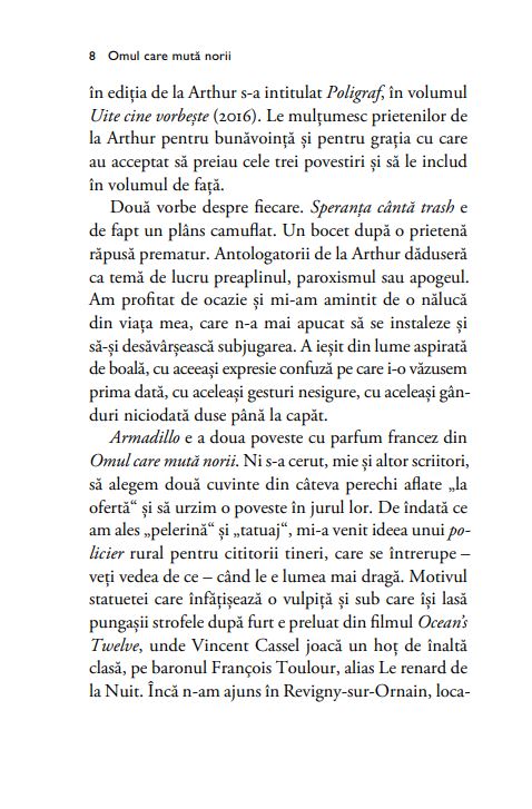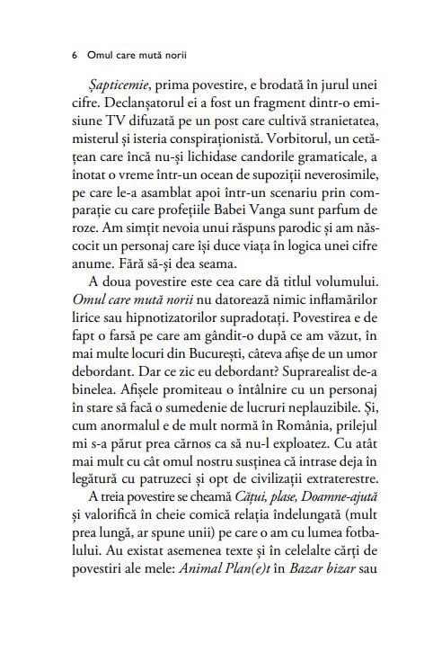 Sunt şapte întâmplări de ieri şi de azi, din Franţa sau din Italia, dintr-un colţ al Bucureştiului sau dintr-altul. În Omul care mută norii, Radu Paraschivescu se suie la volanul prozei scurte şi îşi plimbă cititorii pe un traseu cu o serie de opriri la cerere: stupoare, veselie, tandreţe, deznădejde şi speranţă.
