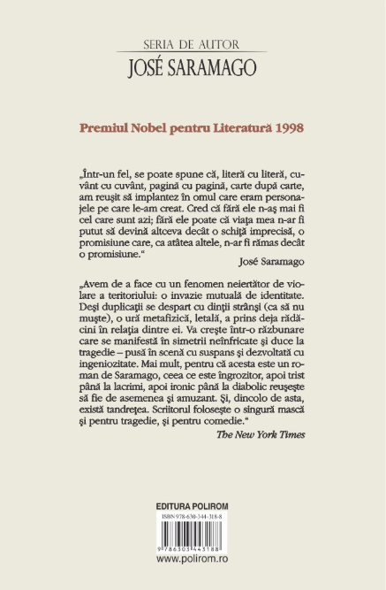 „Avem de-a face cu un fenomen neiertător de violare a teritoriului: o invazie mutuală de identitate. Deși dublurile se despart cu dinții strânși (ca să nu muște), o ură metafizică, letală, a prins deja rădăcini în relația dintre ei. Va crește într-o răzbunare care se manifestă în simetrii neînfricate și duce la tragedie — pusă în scenă cu suspans și dezvoltată cu ingeniozitate. Mai mult, pentru că acesta este un roman de Saramago, ceea ce este îngrozitor, apoi trist până la lacrimi, apoi ironic până la diabolic reușește să fie de asemenea și amuzant. Și, dincolo de asta, există tandrețea. Scriitorul folosește o singură mască și pentru tragedie, și pentru comedie.”
