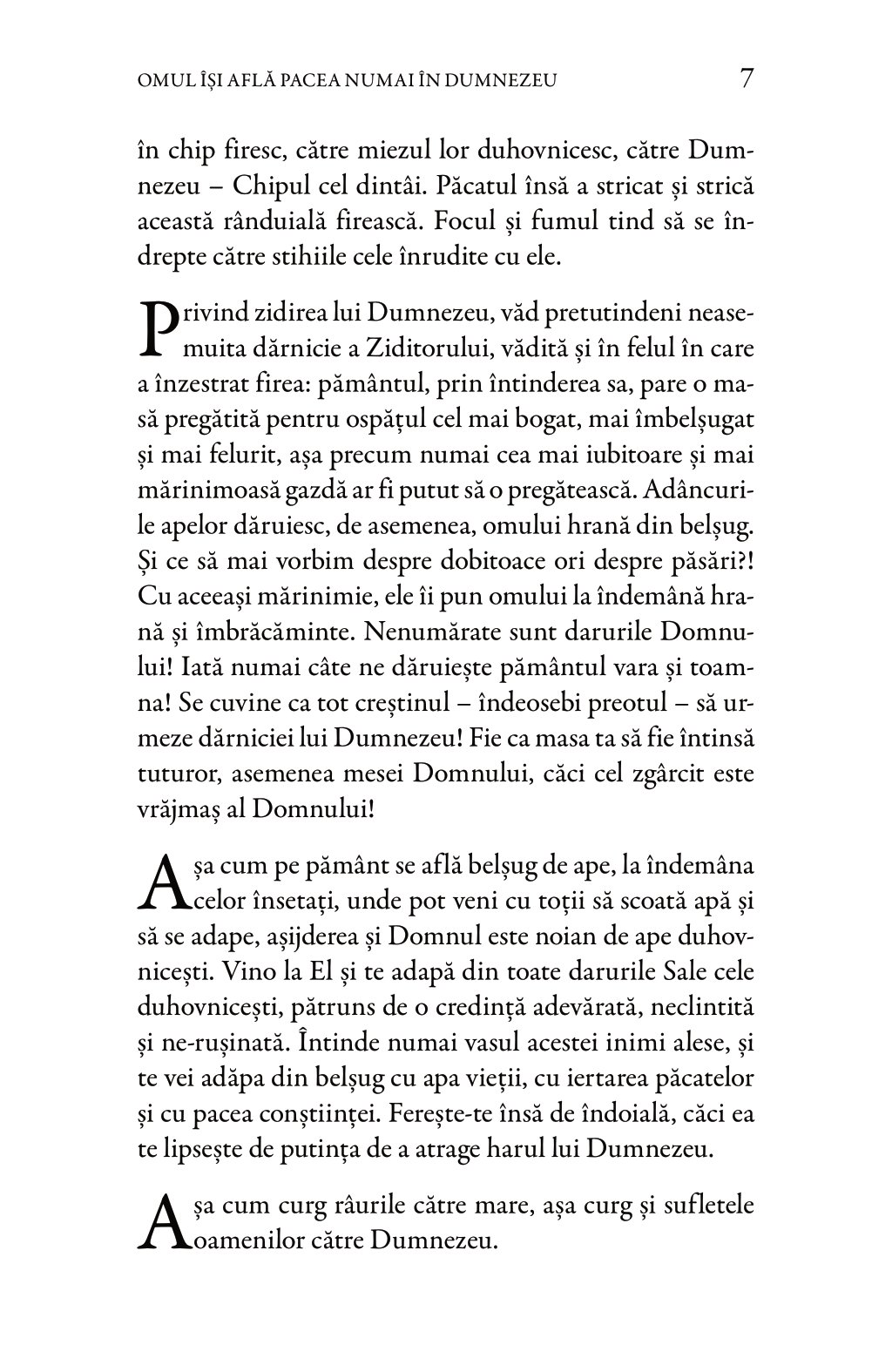 Lumea cea duhovnicească își are izvorul în Duhul lui Dumnezeu și se deosebește precum cerul de pământ de lumea cărnii, a trupului. Este o lume cerească, zidită ca noi să dobândim în ea fericirea. „Pace vouă!”, le grăia Domnul adesea ucenicilor Săi, dăruindu‑le pacea Sa, iar apostolii propovăduiau credincioșilor pacea lui Dumnezeu, urându‑le să se bucure de pacea lui Dumnezeu ca de darul cel mai de preț, tocmai pentru că ea, această pace, este viața sufletului și mărturisește unirea sufletului nostru cu Dumnezeu. Dacă sufletul nu are pace, se tulbură – tulburarea fiind proprie tuturor stărilor celor pătimașe –, aceasta vădind totodată faptul că întru el se înstăpânește moartea duhovnicească, căci în inima noastră lucrează vrăjmașul mântuirii.