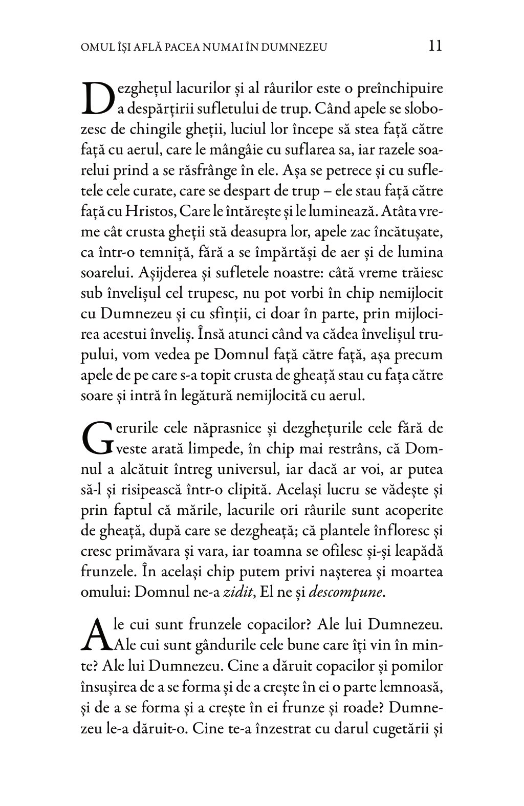 Sufletul, cel ce mă vădește a fi om, trăiește numai prin Dumnezeu și numai în unire cu El. Iar atunci când se desparte de El pătimește grozav. Viața sufletului meu este, de fapt, pacea puterii mele sufletești, iar această pace își are obârșia doar în Dumnezeu. Există, de asemenea, și o lume a trupului – una înșelătoare, de unde îşi iau început viforele care se iscă în suflet. Despre această lume grăia Domnul că „peste ea va veni pieirea”, și oamenii „nu vor avea scăpare” (I Tesaloniceni 5, 3).