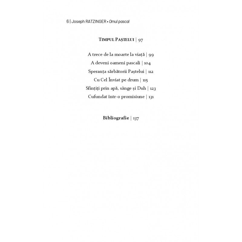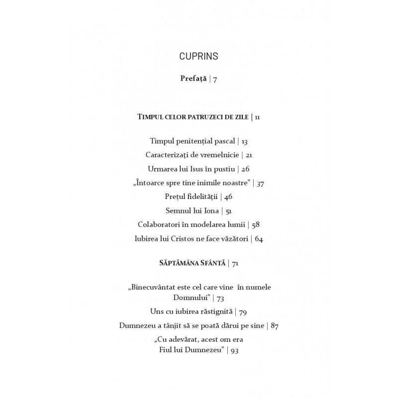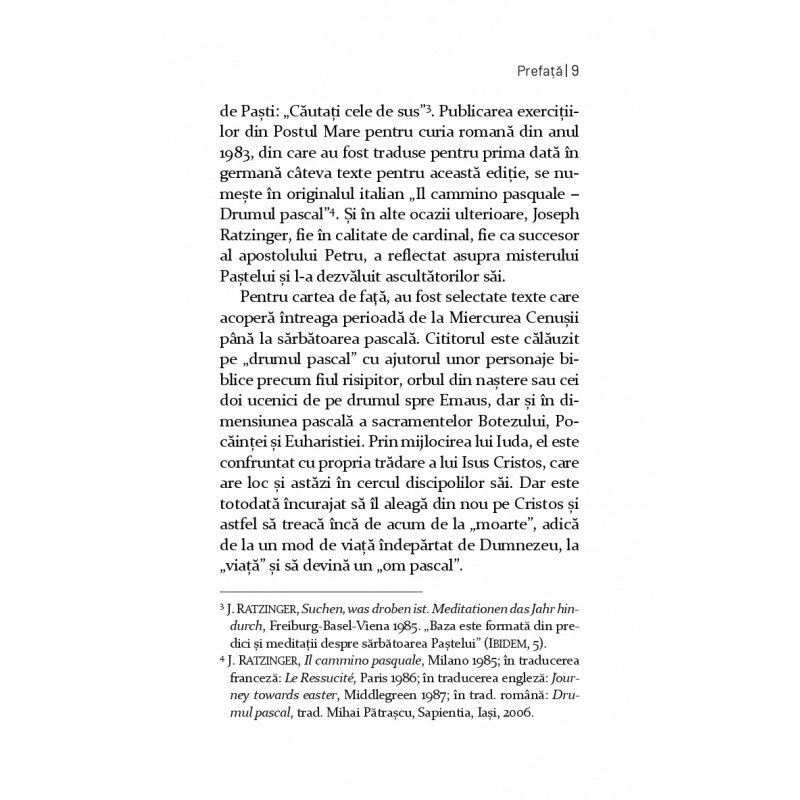 Pentru cartea de faţă, au fost selectate texte care acoperă întreaga perioadă de la Miercurea Cenuşii până la sărbătoarea pascală. Cititorul este călăuzit pe "drumul pascal" cu ajutorul unor personaje biblice precum fiul risipitor, orbul din naştere sau cei doi ucenici de pe drumul spre Emaus, dar şi în dimensiunea pascală a sacramentelor Botezului, Pocăinţei şi Euharistiei. Prin mijlocirea lui luda, el este confruntat cu propria trădare a lui Isus Cristos, care are loc şi astăzi în cercul discipolilor săi. Dar este totodată încurajat să îl aleagă din nou pe Cristos şi astfel să treacă încă de acum de la "moarte", adică de la un mod de viaţă îndepărtat de Dumnezeu, la "viaţă" și să devină un "om pascal". — Dr. Manuel Schlögl