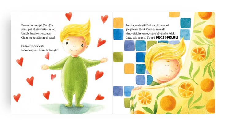 Vrea să știe ce e în jur, vrea să înțeleagă cine îi este aproape, vrea să cuprindă în brațe tot Universul... Deocamdată, în jur e un prosopel, o pisică, un pom. Aproape sunt mama, bunica. Ce e ud și foarte moale? Cine face sfrrrr și te iubește? Și cine e ca nimeni altcineva și se recunoaște dintr-o îmbrățișare? Omulețul Țoc-Țoc descoperă lumea!