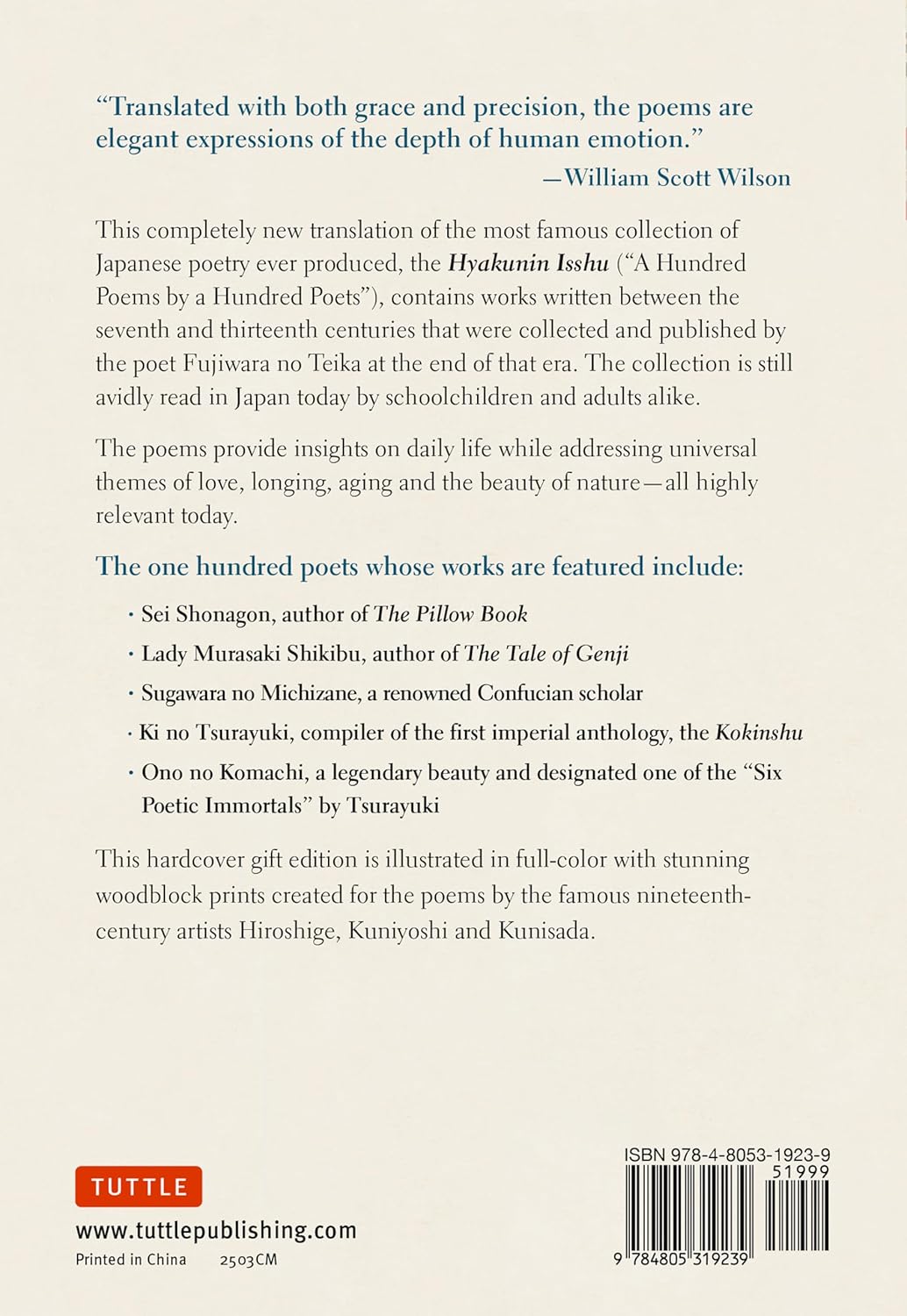 This completely new translation of the most famous collection of Japanese poetry ever produced, the Hyakunin Isshu ("A hundred poems by a hundred poets"), contains works written between the 7th and 8th centuries that were collected and published by the poet Fujiwara no Teika at the end of that era. The collection is still widely read in Japan today by school children and everyday people.