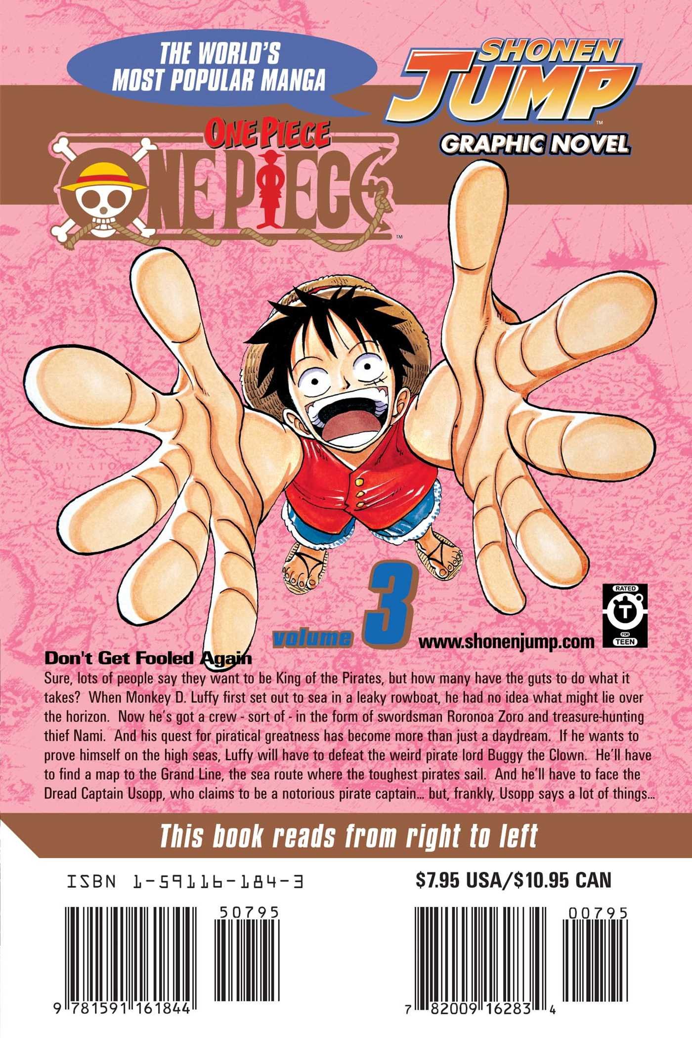Sure, lots of people say they want to be the King of the Pirates, but how many have the guts to do what it takes? When Monkey D. Luffy first set out to sea in a leaky rowboat, he had no idea what might lie over the horizon. Now he's got a crew--sort of--in the form of swordsman Roronoa Zolo and treasure-hunting thief Nami. If he wants to prove himself on the high seas, Luffy will have to defeat the weird pirate lord Buggy the Clown. He'll have to find a map to the Grand Line, the sea route where the toughest pirates sail. And he'll have to face the Dread Captain Usopp, who claims to be a notorious pirate captain...but frankly, Usopp says a lot of things...