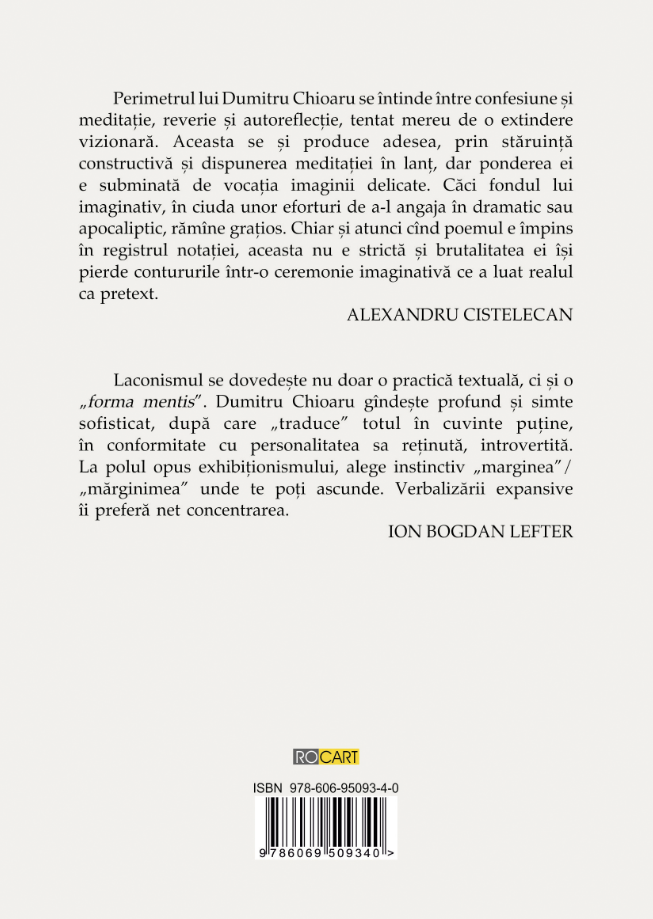 Perimetrul lui Dumitru Chioaru se întinde între confesiune şi meditaţie, reverie şi autoreflecţie, tentat mereu de o extindere vizionară. Aceasta se şi produce adesea, prin stăruinţă constructivă şi dispunerea meditaţiei în lanţ, dar ponderea ei e subminată de vocaţia imaginii delicate. Căci fondul lui imaginativ, în ciuda unor eforturi de a-l angaja în dramatic sau apocaliptic, rămîne graţios. Chiar şi atunci cînd poemul e împins în registrul notaţiei, aceasta nu e strictă şi rutalitatea ei îşipierde contururile într-o ceremonie imaginativă ce a luat realul ca pretext.