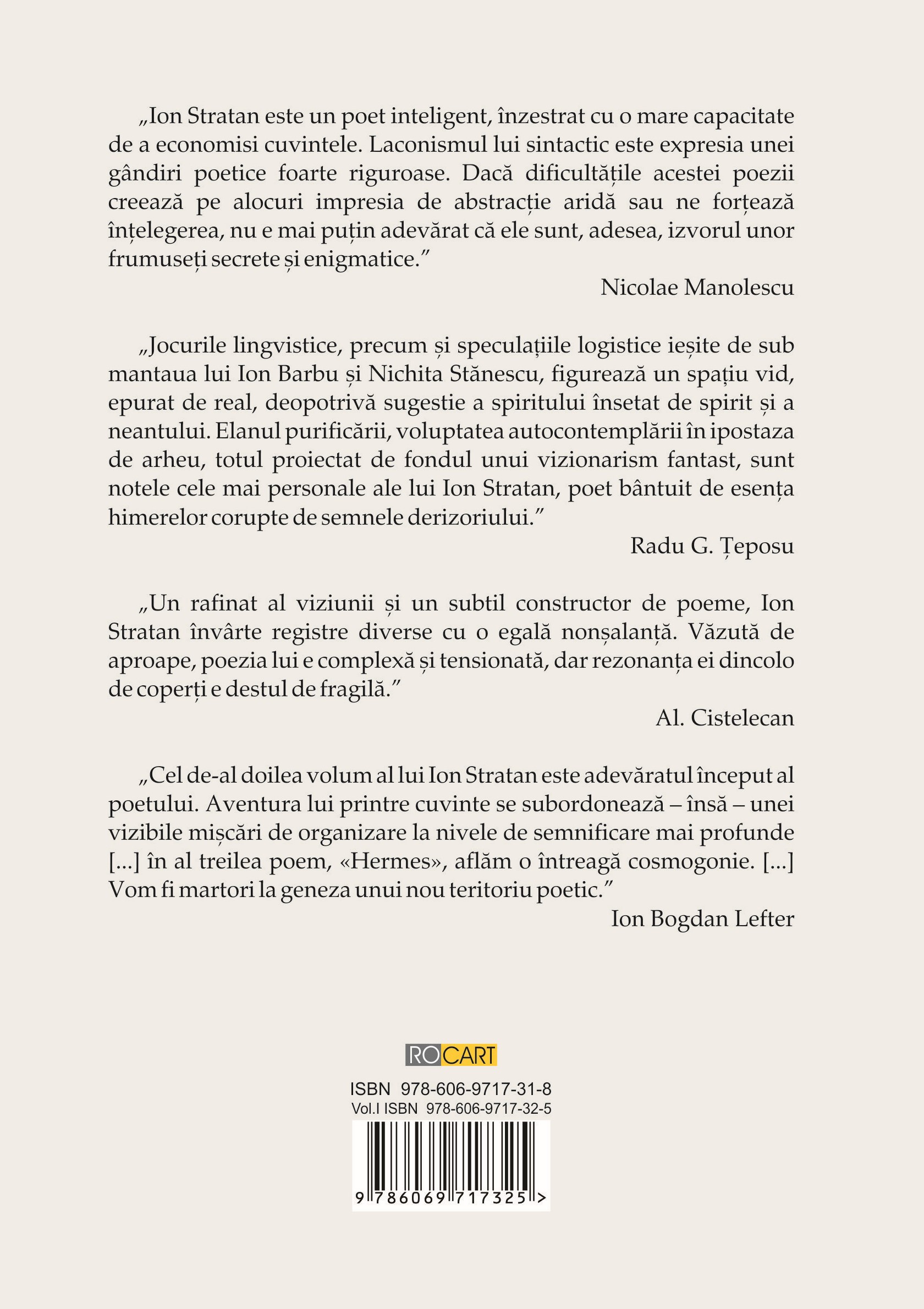 Cel de-al doilea volum al lui Ion Stratan este adevăratul început al poetului. Aventura lui printre cuvinte se subordonează – însă – unei vizibile mişcări de organizare la niveluri de semnificare mai profunde […] în al treilea poem, „Hermes”, aflăm o întreagă cosmogonie. […] Vom fi martori la geneza unui nou teritoriu poetic.