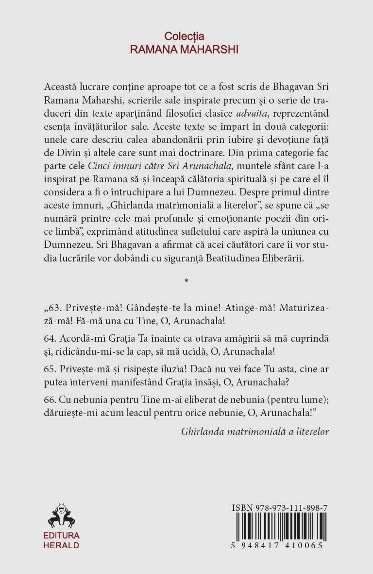 Aceasta lucrare contine aproape tot ce a fost scris de Bhagavan Sri Ramana Maharshi, scrierile sale inspirate precum si o serie de traduceri din texte apartinand filosofiei clasice advaita, reprezentand esenta invataturilor sale. Aceste texte se impart in doua categorii: unele care descriu calea abandonarii prin iubire si devotiune fata de Divin si altele care sunt mai doctrinare. Din prima categorie fac parte cele Cinci imnuri catre Sri Arunachala, muntele sfant care l-a inspirat pe Ramana sa-si inceapa calatoria spirituala si pe care el il considera a fi o intruchipare a lui Dumnezeu. Despre primul dintre aceste imnuri, Ghirlanda matrimoniala a literelor, se spune ca „se numara printre cele mai profunde si emotionante poezii din orice limba”, exprimand atitudinea sufletului care aspira la uniunea cu Dumnezeu. Sri Bhagavan a afirmat ca acei cautatori care ii vor studia lucrarile vor dobandi cu siguranta Beatitudinea Eliberarii.