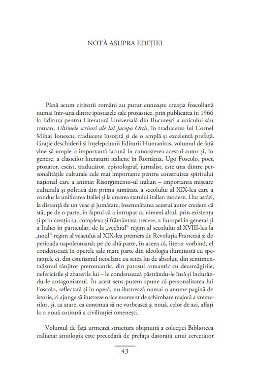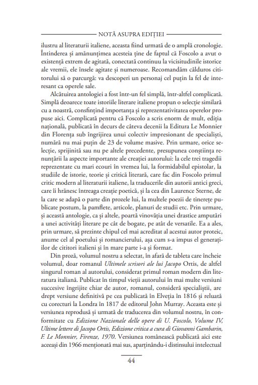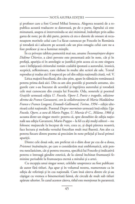 „În scurta sa viaţă trăită la răscrucea a două secole, Ugo Foscolo s-ar zice că adună tradiţia literaturii şi istoriei italiene şi o incendiază în focul viu al trecerii dintre epoci, de la revoluţie la războaiele napoleoniene şi restauraţie. Opera foscoliană abordează teme nenumărate, orientate spre aspecte ale vieţii dintre cele mai felurite, chiar şi spre cele marginale şi neobişnuite, atât ale culturii clasice, cât şi ale celei contemporane. Dar acest belşug de interese este compensat de predilecţia pentru câteva motive constante, care trimit la certitudini şi valori pozitive: tema compasiunii, a mormântului ca emblemă a continuităţii între vii şi morţi, tema patriei, a prieteniei, a iubirii, frumuseţii şi armoniei. În absoluta incertitudine a existenţei aceste repere se prezintă însă ca iluzii. Autorul nu le recunoaşte nici un fundament obiectiv în natură, căci natura îi apare oarbă şi indiferentă la dorinţele şi pasiunile omeneşti; el le resimte mai degrabă ca pe nişte alegeri subiective în care caută consolare şi le atribuie o valoare socială, considerându-le temelia comunităţii civice. «Iluzia» care le conţine şi le rezumă pe toate celelalte este arta şi poezia, care transformă iluziile subiective în forţă civică şi colectivă. Prin artă, Foscolo aspiră la un bine superior, înţeles ca rezolvare a oricărui conflict.“ – GIULIO FERRONI