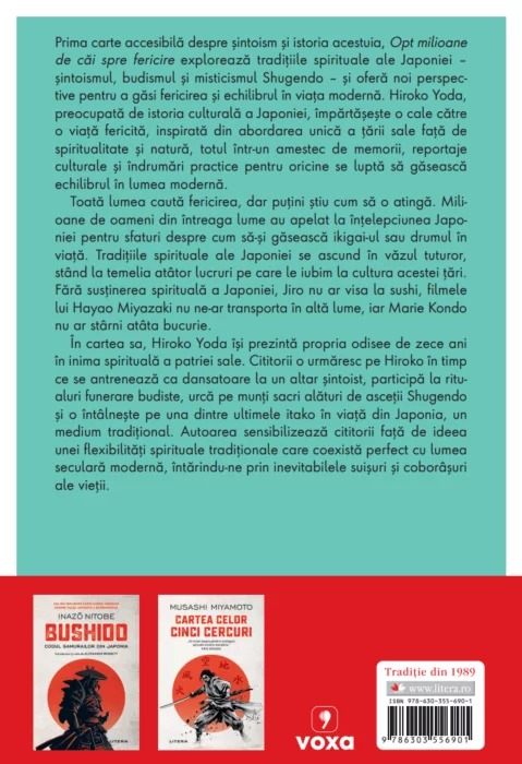 Prima carte accesibilă despre șintoism și istoria acestuia, Opt milioane de căi spre fericire explorează tradițiile spirituale ale Japoniei – șintoismul, budismul și misticismul Shugendo – și oferă noi perspective pentru a găsi fericirea și echilibrul în viața modernă. Hiroko Yoda, preocupată de istoria culturală a Japoniei, împărtășește o cale către o viață fericită, inspirată din abordarea unică a țării sale față de spiritualitate și natură, totul într-un amestec de memorii, reportaje culturale și îndrumări practice pentru oricine se luptă să găsească echilibrul în lumea modernă.