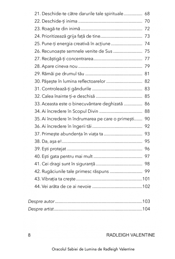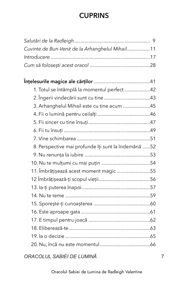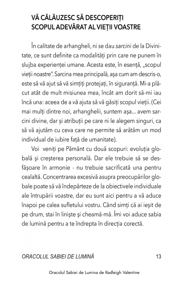 Foloseste aceste carti-oracol zilnic, pentru a capata perspective si intelesuri divine despre relatiile tale, cariera, scopul tau in viata si multe altele. Cuvintele lui Mihail Insusi, transmise din taramul arhanghelilor, iti vor imprastia frica si iti vor oferi intelepciune si intelegere divina. Permite Arhanghelului Mihail sa-si foloseasca sabia de lumina, ca sa taie orice obstacol care te tine pe loc si sa te ghideze spre stralucitoarea viata de lumina si de iubire pe care o meriti din plin!