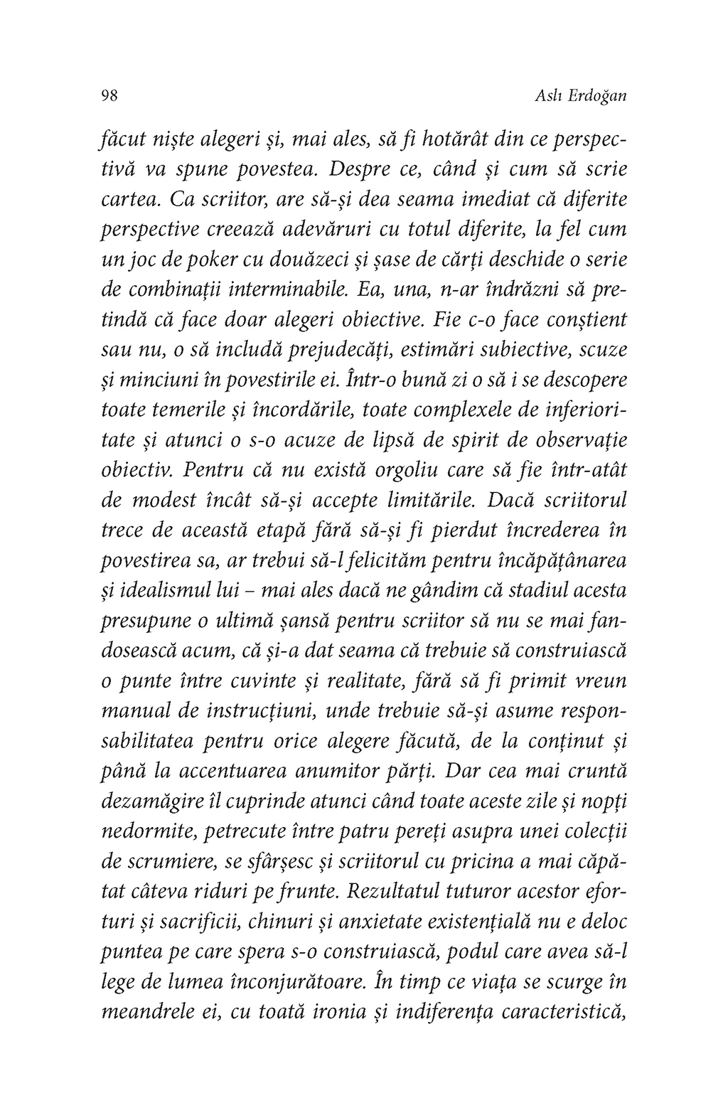 „Aslı Erdoğan este o scriitoare de o percepţie şi o sensibilitate rare, care ne-a dat textul literar perfect.” (Orhan Pamuk)