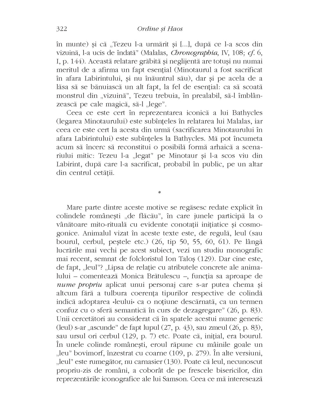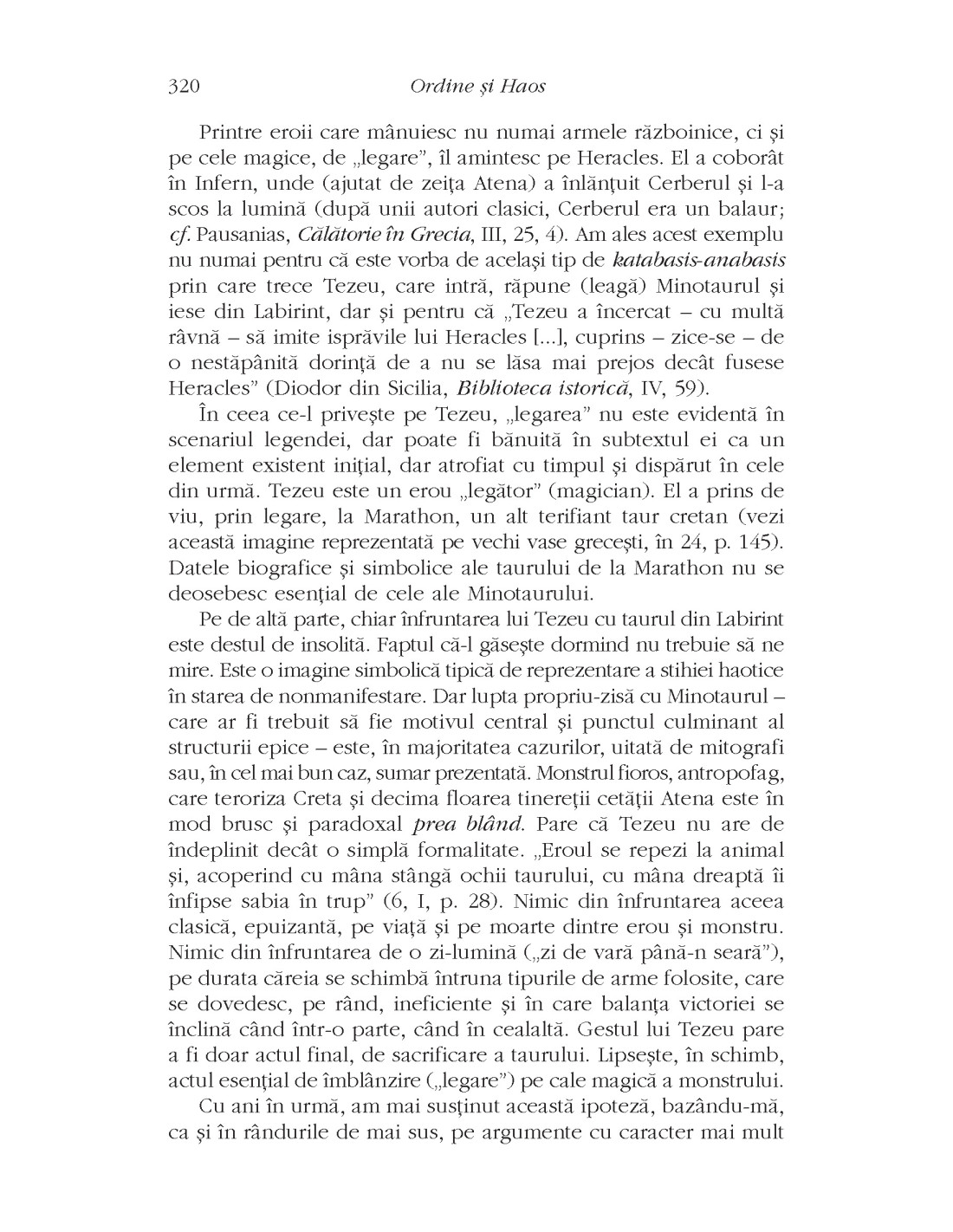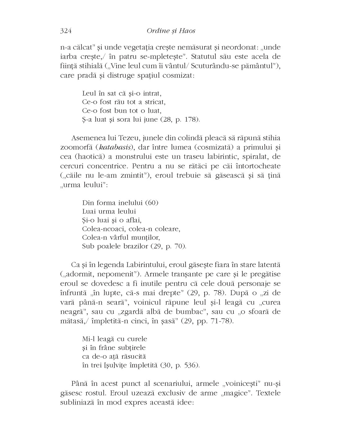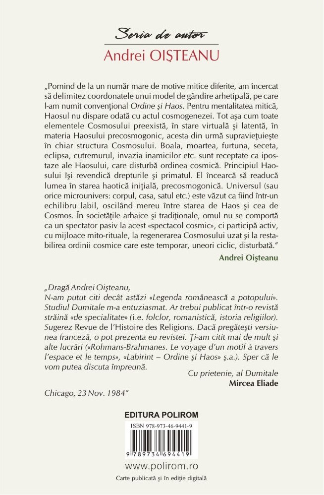 „Pornind de la un număr mare de motive mitice diferite, am încercat să delimitez coordonatele unui model de gândire arhetipală, pe care l-am numit convenţional Ordine şi Haos. Pentru mentalitatea mitică, Haosul nu dispare odată cu actul cosmogenezei. Tot aşa cum toate elementele Cosmosului preexistă, în stare virtuală şi latentă, în materia Haosului precosmogonic, acesta din urmă supravieţuieşte în chiar structura Cosmosului. Boala, moartea, furtuna, seceta, eclipsa, cutremurul, invazia inamicilor etc. sunt receptate ca ipostaze ale Haosului, care disturbă ordinea cosmică. Principiul Haosului îşi revendică drepturile şi primatul. El încearcă să readucă lumea în starea haotică iniţială, precosmogonică. Universul (sau orice microunivers: corpul, casa, satul etc.) este văzut ca fiind într-un echilibru labil, oscilând mereu între starea de Haos şi cea de Cosmos. În societăţile arhaice şi tradiţionale, omul nu se comportă ca un spectator pasiv la acest «spectacol cosmic», ci participă activ, cu mijloace mito-rituale, la regenerarea Cosmosului uzat şi la restabilirea ordinii cosmice care este temporar, uneori ciclic, disturbată.” (Andrei Oişteanu)