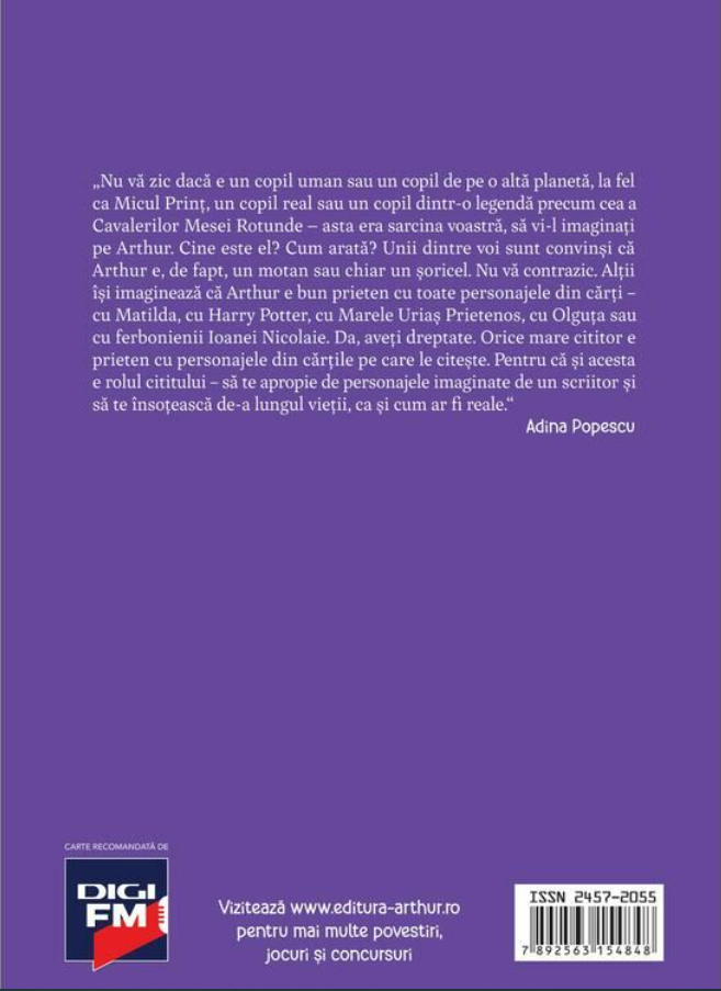 „Nu vă zic dacă e un copil uman sau un copil de pe o altă planetă, la fel ca Micuțul Prinț, un copil real sau un copil dintr-o legendă precum cea a Cavalerilor Mesei Rotunde - asta era sarcina voastră, să vi-l imaginați pe Arthur. Cine este el? Cum arată? Unii dintre voi sunt convinși că Arthur e, de fapt, un motan sau chiar un șoricel. Nu vă contrazic. Alții își imaginează că Arthur e bun prieten cu toate personajele din cărți - cu Matilda, cu Harry Potter, cu Marele Uriaș Prietenos, cu Olguța sau cu ferbonienii Ioanei Nicolaie. Da, aveți dreptate. Orice mare cititor e prieten cu personajele din cărțile pe care le citește. Pentru că și acesta e rolul cititorului - să te apropie de personajele imaginate de un scriitor și să te însoțească de-a lungul vieții, ca și cum ar fi reale." Adina Popescu
