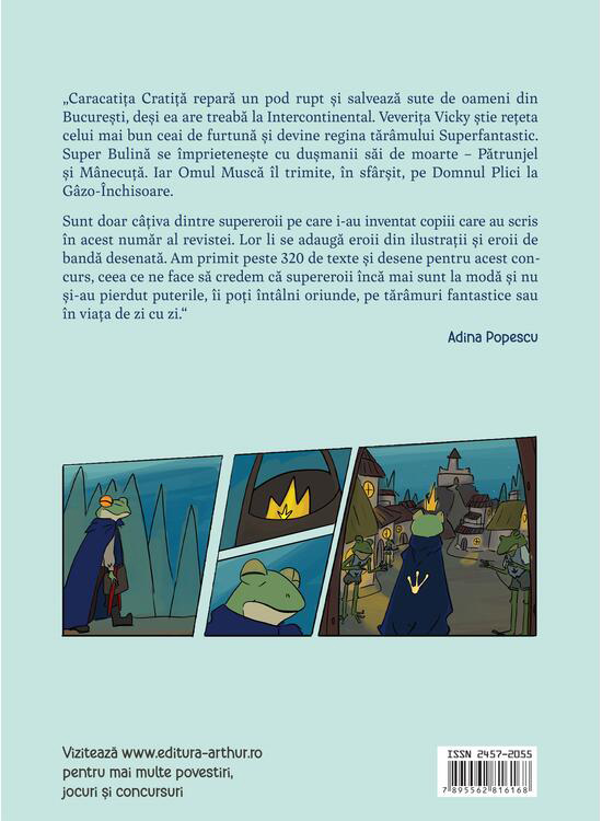 Sunt doar câțiva dintre supereroii pe care i-au inventat copiii care au scris în acest număr al revistei. Lor li se adaugă eroii din ilustrații şi eroii de bandă desenată. Am primit peste 320 de texte şi desene pentru acest concurs, ceea ce ne face să credem că supereroii încă mai sunt la modă şi nu şi-au pierdut puterile, îi poți întâlni oriunde, pe tărâmuri fantastice sau în viaţa de zi cu zi."