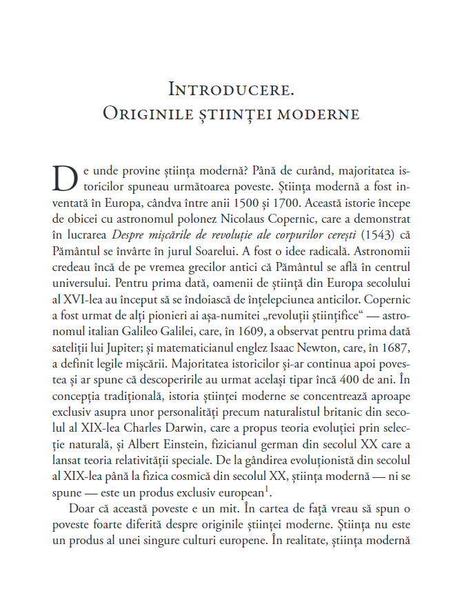 Când ne referim la originile științei moderne, începem de obicei cu Europa. Ne amintim de marile minți ale lui Nicolaus Copernic, Isaac Newton, Charles Darwin și Albert Einstein. Dar istoria științei nu este și nu a fost niciodată un efort exclusiv european. Copernic s-a bazat pe tehnicile matematice provenind din texte arabe și persane. Legile mișcării ale lui Newton au plecat de la observații astronomice realizate în Asia și Africa. Când Darwin scria Despre originea speciilor, a consultat o enciclopedie chineză din secolul al XVI-lea. Și când Einstein a studiat mecanica cuantică, a avut ca sursă de inspirație pe de fizicianul bengalez, Satyendra Nath Bose.
