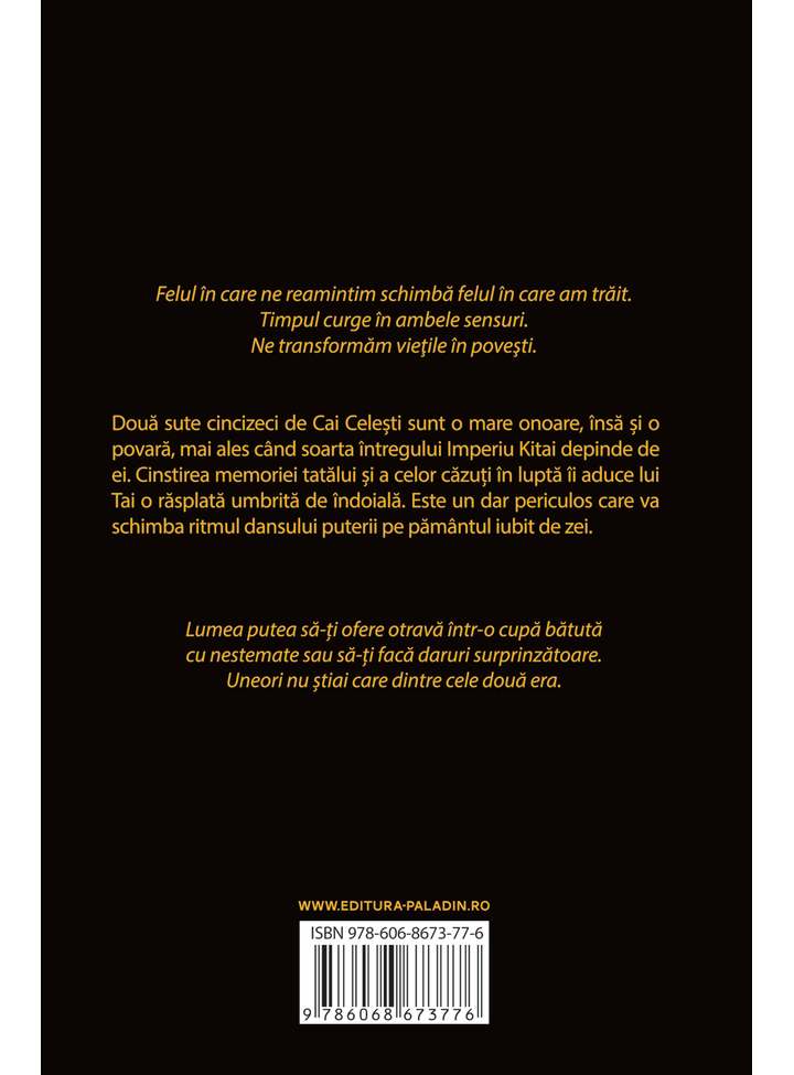 Două sute cincizeci de Cai Celești sunt o mare onoare, însă și o povară, mai ales când soarta întregului Imperiu Kitai depinde de ei. Cinstirea memoriei tatălui și a celor căzuți în luptă îi aduce lui Tai o răsplată umbrită de îndoială. Este un dar periculos care va schimba ritmul dansului puterii pe pământul iubit de zei.