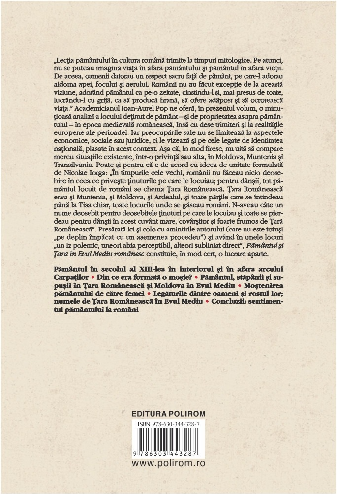 „Lecția pământului în cultura română trimite la timpuri mitologice. Pe atunci, nu se puteau imagina viața în afara pământului și pământul în afara vieții. De aceea, oamenii datorau un respect sacru față de pământ, pe care-l adorau aidoma apei, focului și aerului. Românii nu au făcut excepție de la această viziune, adorând pământul ca pe-o zeitate, cinstindu-l și, mai presus de toate, lucrându-l cu grijă, ca să producă hrană, să ofere adăpost și să ocrotească viața.” Academicianul Ioan-Aurel Pop ne oferă, în prezentul volum, o minuțioasă analiză a locului deținut de pământ – și de proprietatea asupra pământului – în epoca medievală românească, însă cu dese trimiteri și la realitățile europene ale perioadei. Iar preocupările sale nu se limitează la aspectele economice, sociale sau juridice, ci le vizează și pe cele legate de identitatea națională, plasate în acest context. Așa că, în mod firesc, nu uită să compare mereu situațiile existente, într-o privință sau alta, în Moldova, Muntenia și Transilvania. Poate și pentru că e de acord cu ideea de unitate formulată de Nicolae Iorga: „În timpurile cele vechi, românii nu făceau nicio deosebire în ceea ce privește ținuturile pe care le locuiau; pentru dânșii, tot pământul locuit de români se chema Țara Românească. Țara Românească erau și Muntenia, și Moldova, și Ardealul, și toate părțile care se întindeau până la Tisa chiar, toate locurile unde se găseau români. N-aveau câte un nume deosebit pentru deosebitele ținuturi pe care le locuiau și toate se pierdeau pentru dânșii în acest cuvânt mare, covârșitor și foarte frumos de Țară Românească”. Presărată ici și colo cu amintirile autorului (care nu este totuși „pe deplin împăcat cu un asemenea procedeu”) și având în unele locuri „un iz polemic, uneori abia perceptibil, alteori subliniat direct”, Pământul și Țara în Evul Mediu românesc constituie, în mod cert, o lucrare aparte.
