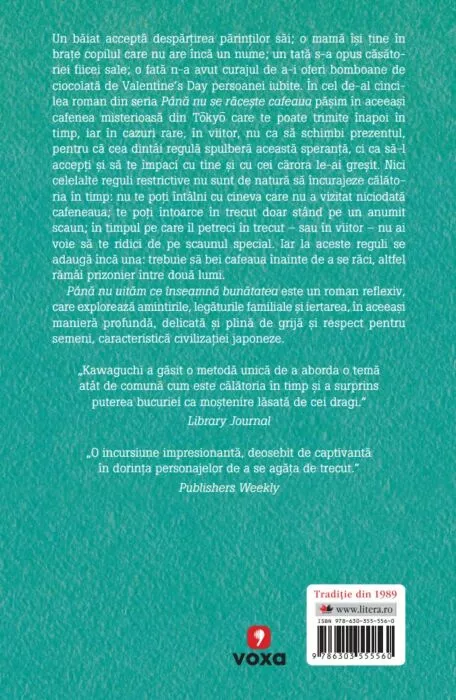 Un băiat acceptă despărţirea părinţilor săi; o mamă îşi ţine în braţe copilul care nu are încă un nume; un tată s-a opus căsătoriei fiicei sale; o fată n-a avut curajul de a-i oferi bomboane de ciocolată de Valentine’s Day persoanei iubite. În cel de-al cincilea roman din seria Până nu se răceşte cafeaua păşim în aceeaşi cafenea misterioasă din Tokyo care te poate trimite înapoi în timp, iar în cazuri rare, în viitor, nu ca să schimbi prezentul, pentru că cea dintâi regulă spulberă această speranţă, ci ca să-l accepţi şi să te împaci cu tine şi cu cei cărora le-ai greşit. Nici celelalte reguli restrictive nu sunt de natură să încurajeze călătoria în timp: nu te poţi întâlni cu cineva care nu a vizitat niciodată cafeneaua; te poţi întoarce în trecut doar stând pe un anumit scaun; în timpul pe care îl petreci în trecut – sau în viitor – nu ai voie să te ridici de pe scaunul special. Iar la aceste reguli se adaugă încă una: trebuie să bei cafeaua înainte de a se răci, altfel rămâi prizonier între două lumi.