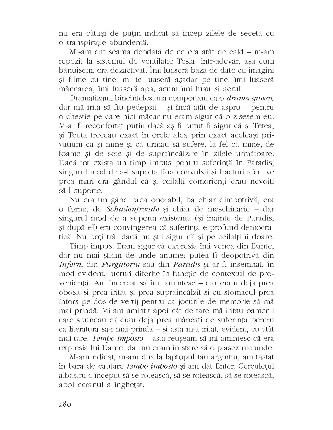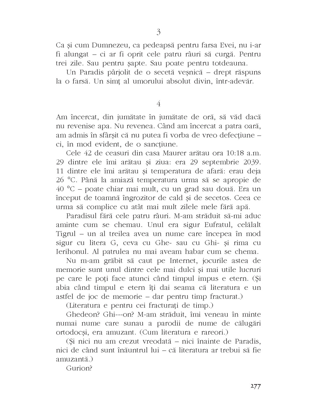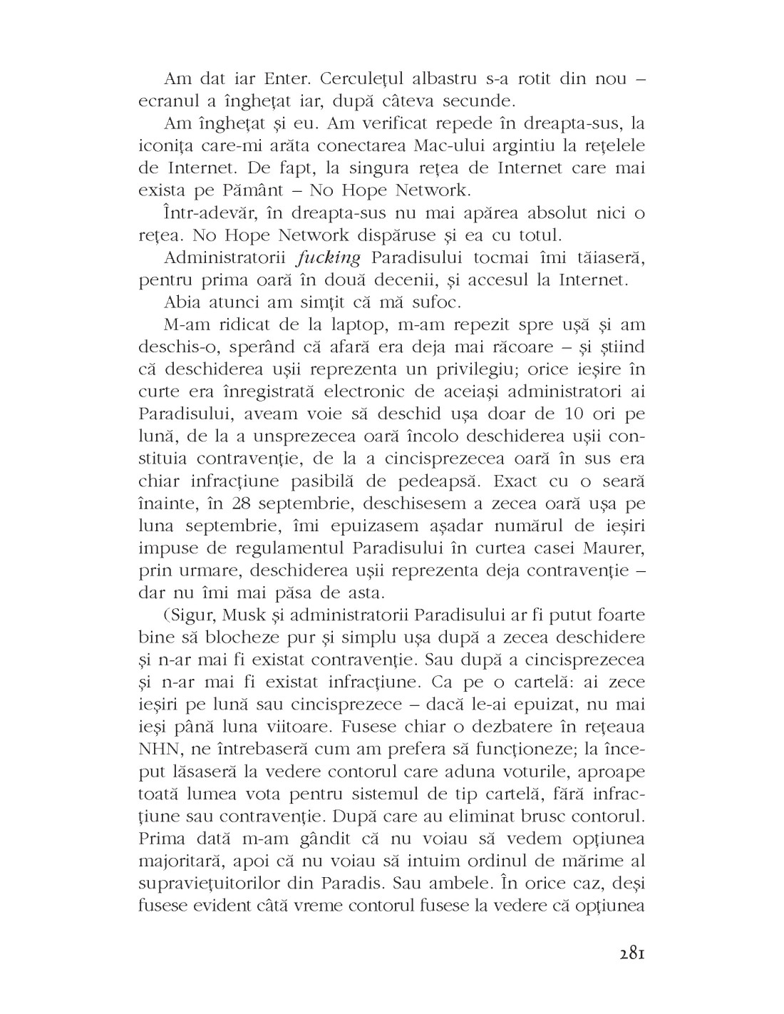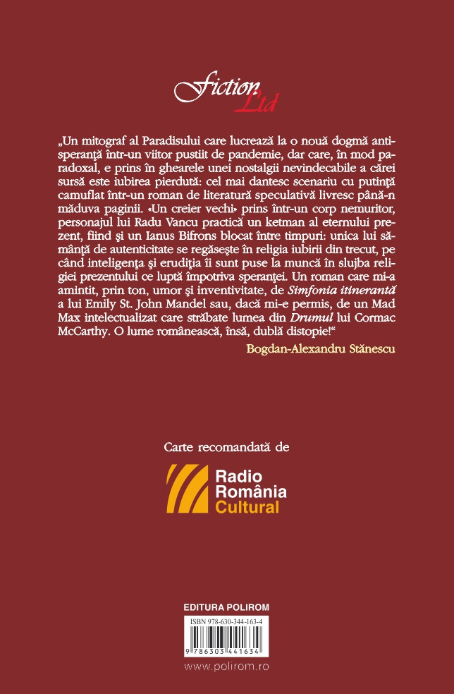 „Un mitograf al Paradisului care lucrează la o nouă dogmă antisperanță într-un viitor pustiit de pandemie, dar care, în mod paradoxal, e prins în ghearele unei nostalgii nevindecabile a cărei sursă este iubirea pierdută: cel mai dantesc scenariu cu putință camuflat într-un roman de literatură speculativă livresc până-n măduva paginii. «Un creier vechi» prins într-un corp nemuritor, personajul lui Radu Vancu practică un ketman al eternului prezent, fiind și un Ianus Bifrons blocat între timpuri: unica lui sămânță de autenticitate se regăsește în religia iubirii din trecut, pe când inteligența și erudiția îi sunt puse la muncă în slujba religiei prezentului ce luptă împotriva speranței. Un roman care mi-a amintit, prin ton, umor și inventivitate, de Simfonia itinerantă a lui Emily St. John Mandel sau, dacă mi-e permis, de un Mad Max intelectualizat care străbate lumea din Drumul lui Cormac McCarthy. O lume românească, însă, dublă distopie!” (Bogdan-Alexandru Stănescu)