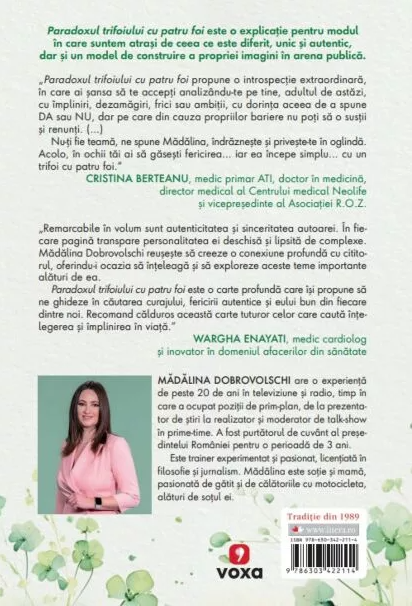 Paradoxul trifoiului cu patru foi este o carte profundă care își propune să ne ghideze în căutarea curajului, fericirii autentice și eului bun din fiecare dintre noi. Recomand călduros această carte tuturor celor care caută înțelegerea și împlinirea în viață.“ WARGHA ENAYATI, medic cardiolog și inovator în domeniul afacerilor din sănătate